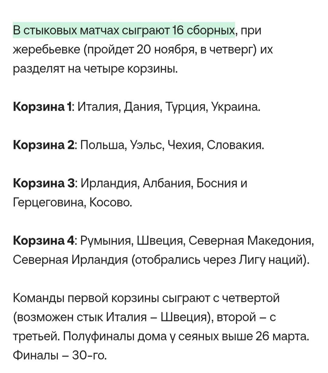 >>3414204 >только первые места выходят Занявшие 1 места в Лиге Наций попадают в стыки и имеют шанс на чм. Из таких сборных Швеция, Сев. Ирландия к примеру