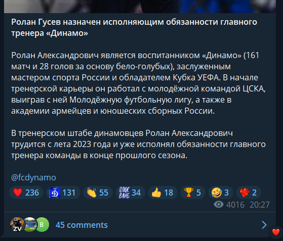 Бля, они же сосать так перестанут ээ, вы чо > До конца года исполнять обязанности главного тренера «Динамо» будет Ролан Гусев, заявил во «Интерфаксу» член совета директоров, глава консультативного совета клуба Сергей Степашин.