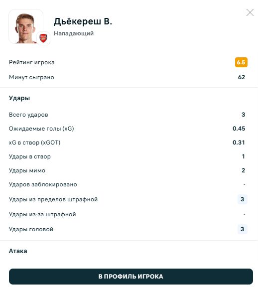 - 3 удара - 1 в створ - 0 голов - 0 передач - 5 касаний в штрафной соперника - 1 самая стильная укладка на поле