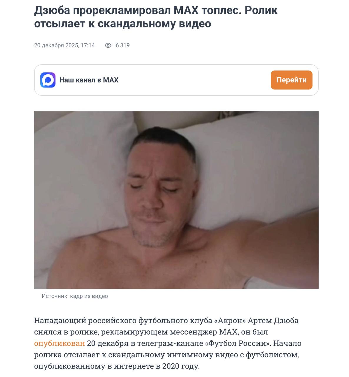 Бывший нападающий российского футбольного клуба «Зенит» Артем Дзюба снялся в ролике, рекламирующем мессенджер MАХ, он был опубликован 20 декабря в телеграм-канале «Футбол России». Начало ролика отсылает к скандальному интимному видео с футболистом.