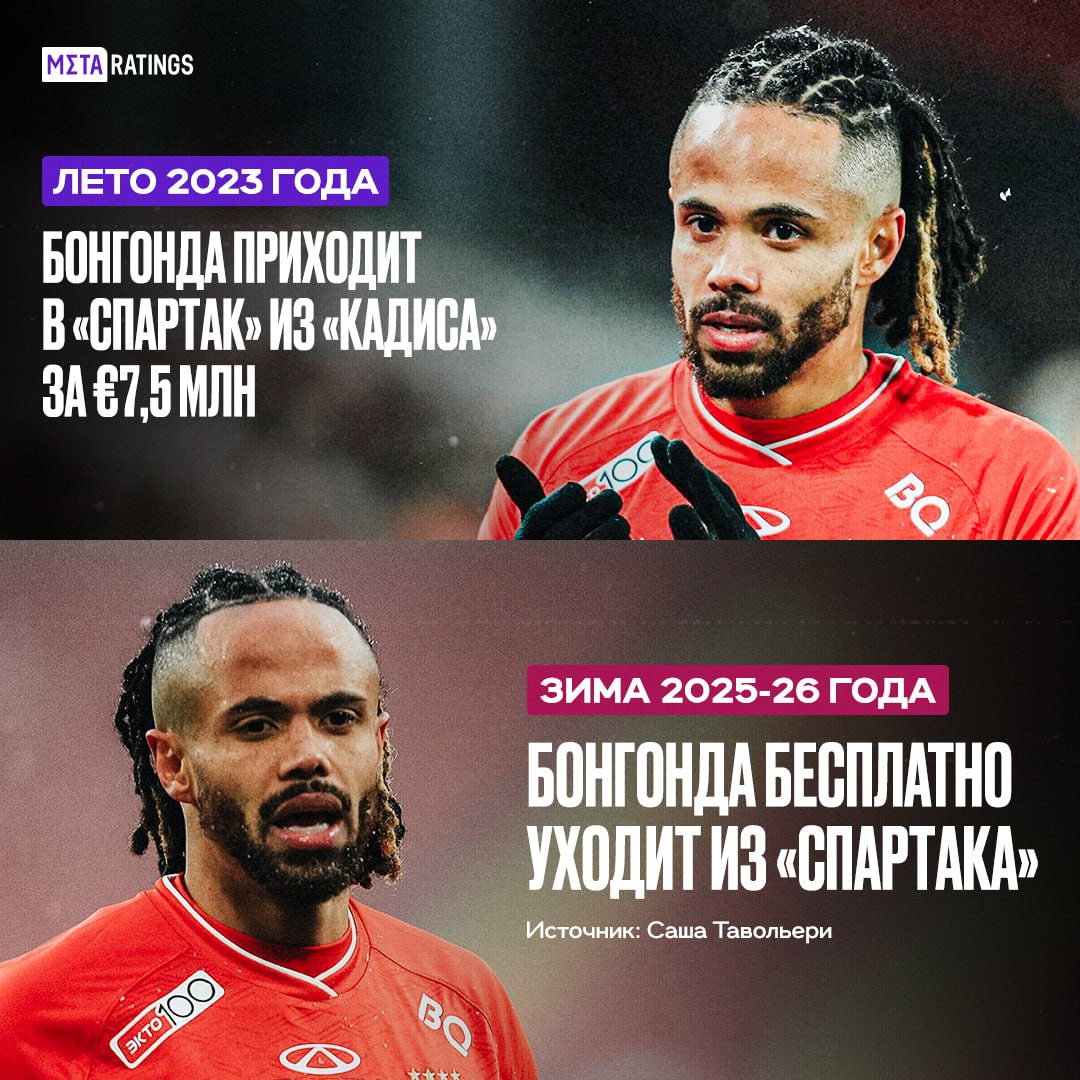 ⚡ Бонгонда бесплатно уходит из «Спартака» зимой: руководство красно-белых уже разрешило вингеру покинуть команду во время зимней паузы. Некоторые иностранные клубы направили запрос на бесплатный трансфер 30-летнего игрока, который на днях забил и принёс победу сборной ДР Конго в матче Кубка Африки. «Спартак» покупал Бонгонда за 10 млн евро с учётом бонусов: Тео набрал «16+6» в 74 матчах. Ранее «Спартак» уже отпускал бесплатно Медину, Абену, Виллиана Жозе, Бальде и других футболистов — журналист Саша Тавольери