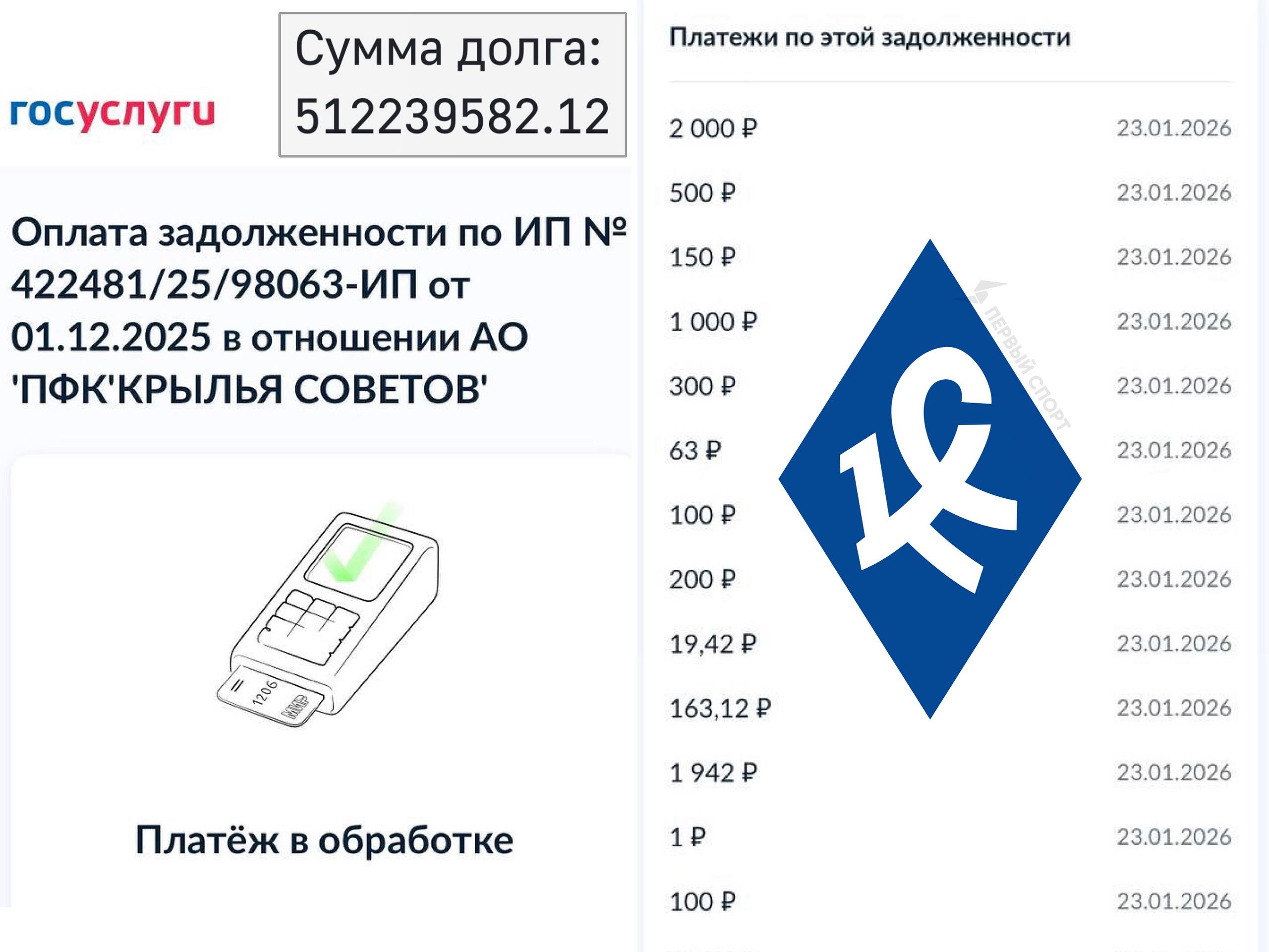 Фанаты «Крыльев» начали скидываться на погашение долгов клуба: жители Самары решили помочь руководству с выплатой огромного долга перед дочерней компанией «Ростеха» – из-за задолженности «Крыльям» уже запретили регистрировать новичков. Фанаты формируют квитанции на «Госуслугах» и оплачивают долг по частям, «донатя» по 1₽, 19,42₽, 63₽, 140,88₽: крупнейший платёж – 2000₽. За пятницу болельщики перевели приставам 21 602 рубля и 72 копейки: теперь «Крыльям» осталось найти всего 512 млн рублей до 5 февраля, чтобы клуб РПЛ не признали банкротом