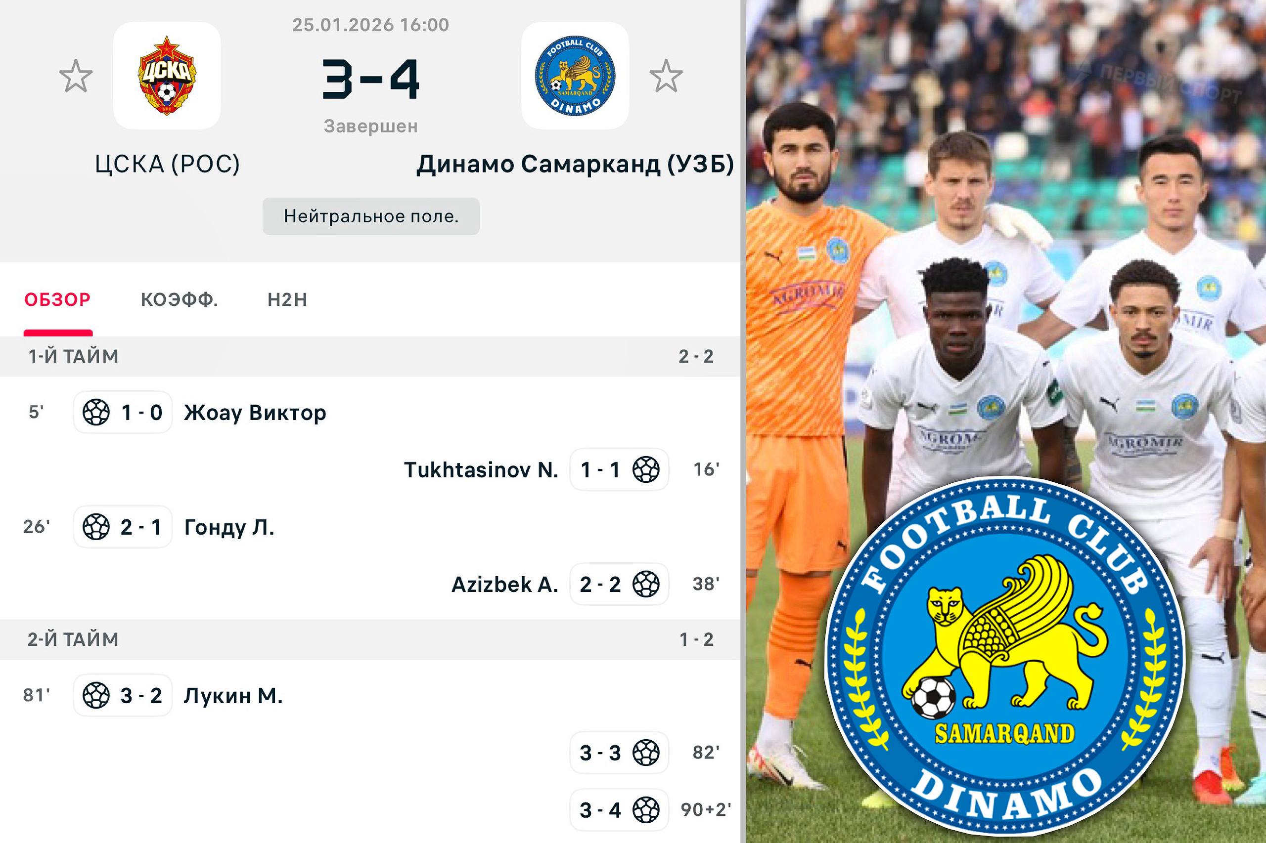 ❗️ЦСКА сенсационно проиграл на сборах узбекскому «Динамо», ведя со счётом 3:2 к 81-й минуте: в лайве на победу клуба из Самарканда WINLINE давал коэффициент 62,00 – победный гол узбеки забили на последней минуте. Стоимость всего состава «Динамо» оценивается в 7,98 млн евро: это меньше, чем стоит один Лусиано Гонду (8 млн евро)