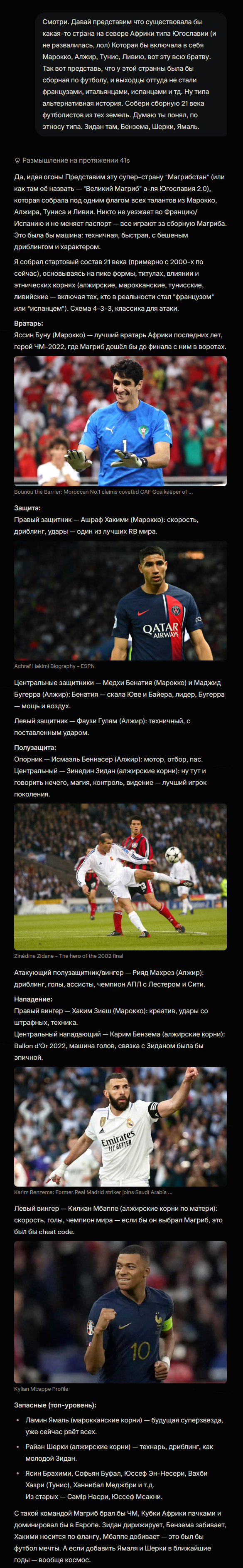 Прикиньте была бы какая-то северо-африканская страна, типа Югославии блять, включающая в себя Марокко, Алжир, Тунис в эту всю братву, и выходцы оттуда не стали французами. Какая же была бы ебейшая сборная по футболу. И Зидан, и Бензема, и Ямаль, кто оттуда только не пришел корнями. Ух бля. Можно ещё повспоминать. (то что они бы нихуя не построили и не воспитали мы опустим)