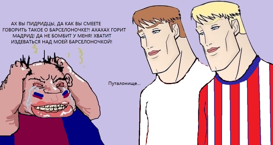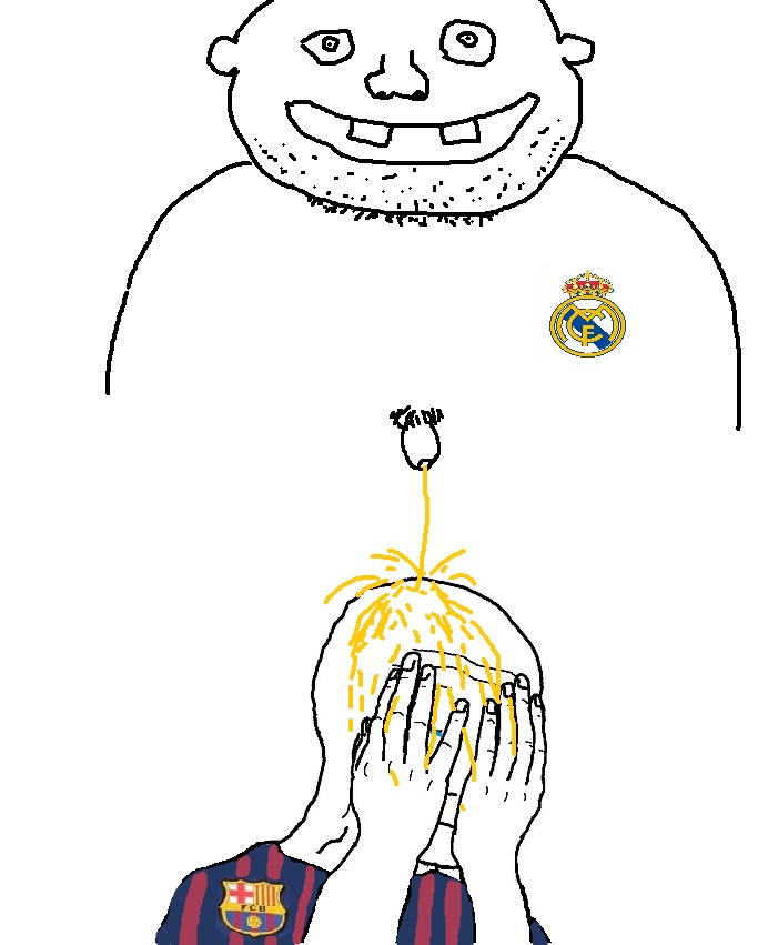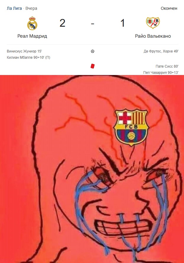 Без негатива к Реалу, или симпатии к Барсе, но всё равно... Объективно: Каким же надо быть чмохеном, чтобы перемогать ссаной победой на 90+10 победой с пенальти над ебучим Райо. Омегалул. Смолл дик энерджи.