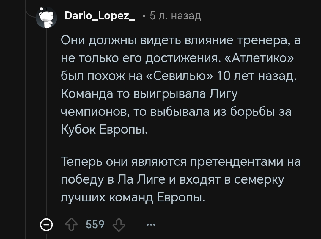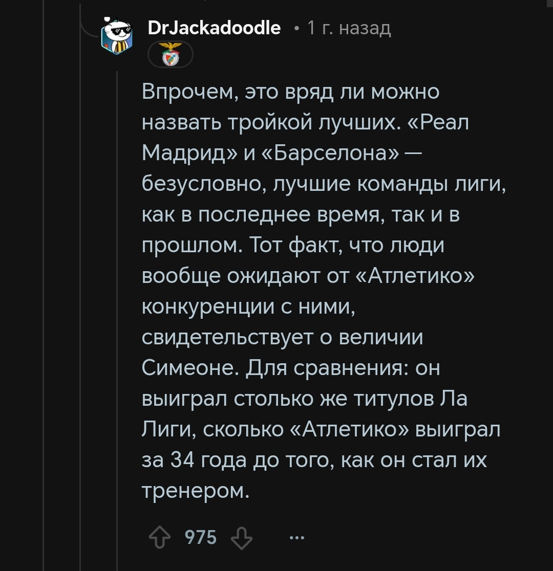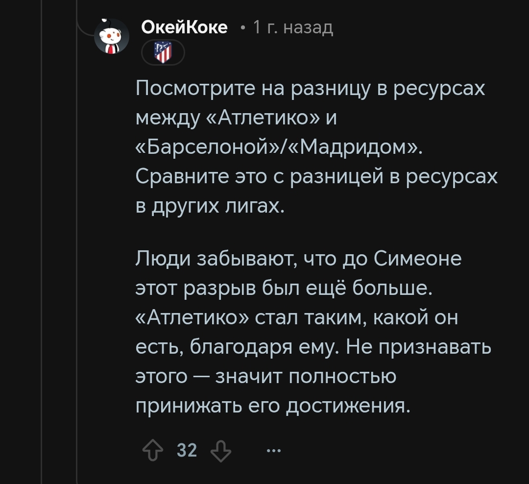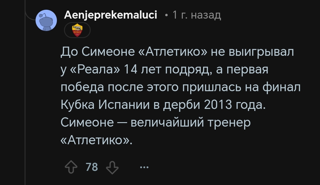 Причём тут Симеоне решительно непонятно. За год до него команда Кике Санчеса Флореса выигрывала ЛЕ и побеждала в Суперкубке УЕФА Интер который только что сделал требл. Спасибо Сересо за точечные трансферные решения в 2010-2020х. Ну и Симеоне тоже спасибо за то, что понял, как нужно выигрывать титулы в лиге где есть Реал и Барса. Но все равно так завышать его не стоит, тем более спустя столько лет отсутствия трофеев при чуть ли не самых больших тратах в лиге последние лет 5