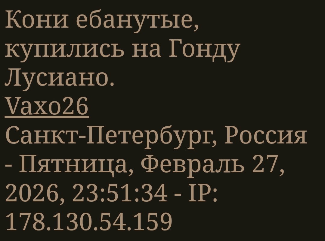 Это какой-то ГВК. И в атаке "Денис Попов". Тошно смотреть на это. Goldstream Санкт-Петербург, Россия - Пятница, Февраль 27, 2026, 21:35:48 - IP: 188.227.10.24