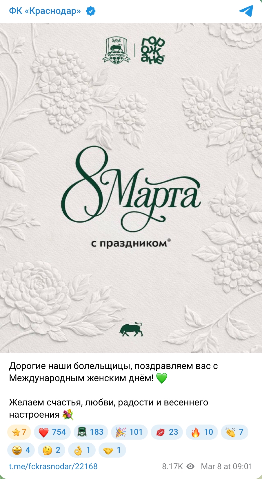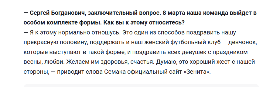 «В этот особенный для всех наших болельщиц день я хотел бы извиниться от лица всей команды за неудовлетворительный результат. Нам было очень важно порадовать вас сегодня победой, но, увы, не получилось. Мы сделаем выводы и будем стараться радовать вас новыми победами»