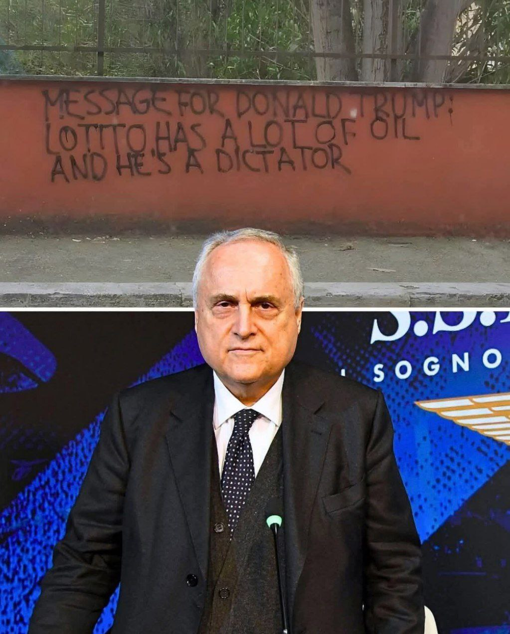 >>3442548 Продолжаю тему подобных рофлов. Болельщики Лацио написали на заборе (да такой уровень фан фактов) "передайте Трампу, что Лотито диктатор и у него есть нефть"