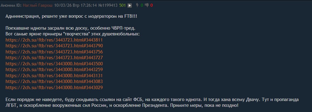 >>3445474 Я об этом пишу уже недели две-три как цскальная гомосолдатка начала срать хохляцкой гурятиной. Год назад любая давка свинтака заканчивалась баном, а теперь безногое монинское чучело срёт здесь русофобией, оскорбляет нашего президента, страну и народ - и нихуя. Я каждый день репорты кидаю на его высеры - нихуя. Если в какой-то момент моча кинет пермач гомосолдатке, возможно, что последние тредов 50 обнулятся просто, настолько эта цскальная блядина насеменила
