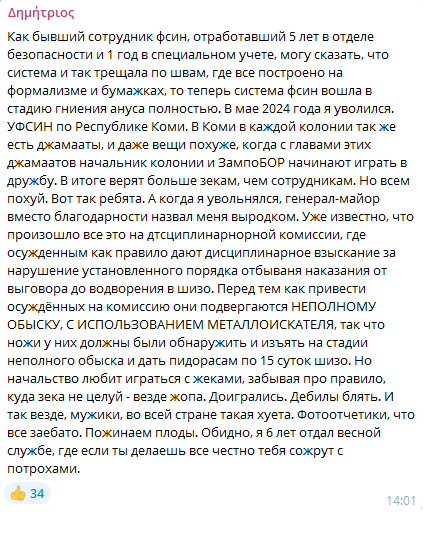 Да, я на пенсии. Начинал на севере в Коми в УФСИН с младшего инспектора, потом работал инспектром отдела безопасности по работе с осужденными к пожизненному лишению свободы, есть там одно учреждение больница для осужденных называется, привозят туда пожизненников из Харпа, заканчивал уже начальником отдела специального учета. Потом мне просто надоело (пидорнули ссанными тряпками - прим.), потому что я от и до в колонеиских делах все знал (сосал хуй Куму, подкидывал запрет зэкам - прим.), шло профессиональное выгорание ( в анусе- прим.)