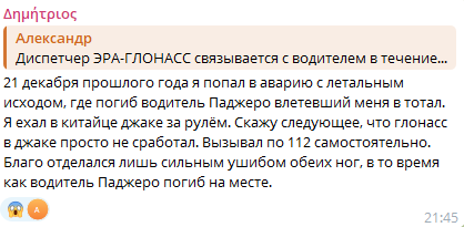 21 декабря прошлого года я попал в аварию с летальным исходом, где погиб водитель Паджеро влетевший меня в тотал. Я ехал в китайце джаке за рулём. Скажу следующее, что глонасс в джаке просто не сработал. Вызывал по 112 самостоятельно. Благо отделался лишь сильным ушибом обеих ног, в то время как водитель Паджеро погиб на месте.