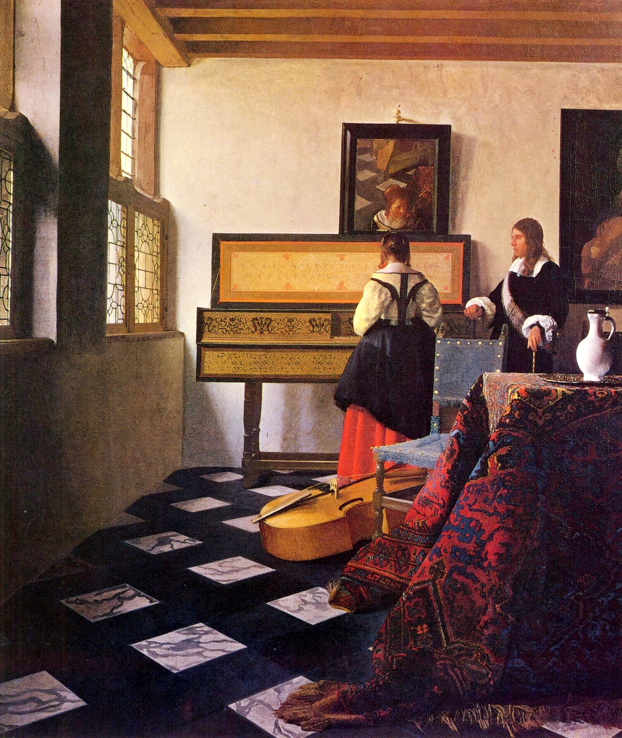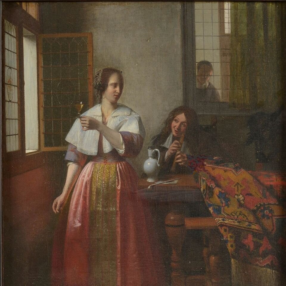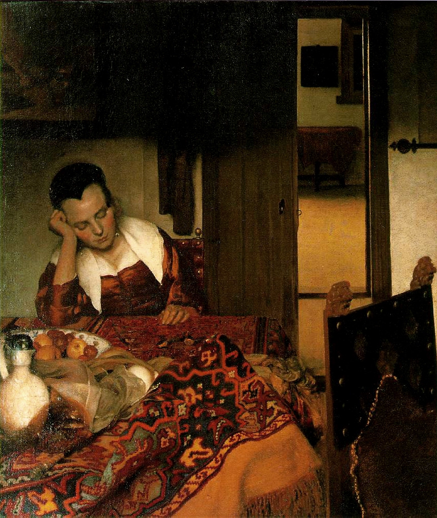 >>432891 Натурщица та же, что и для "Гитаристки", и оттопыренный мизинец явная пародия на неё, внимание к деталям то же, но контраст света и цветов мягче, похоже, что это работа одного из его учеников, возможно при участии самого Вермеера.