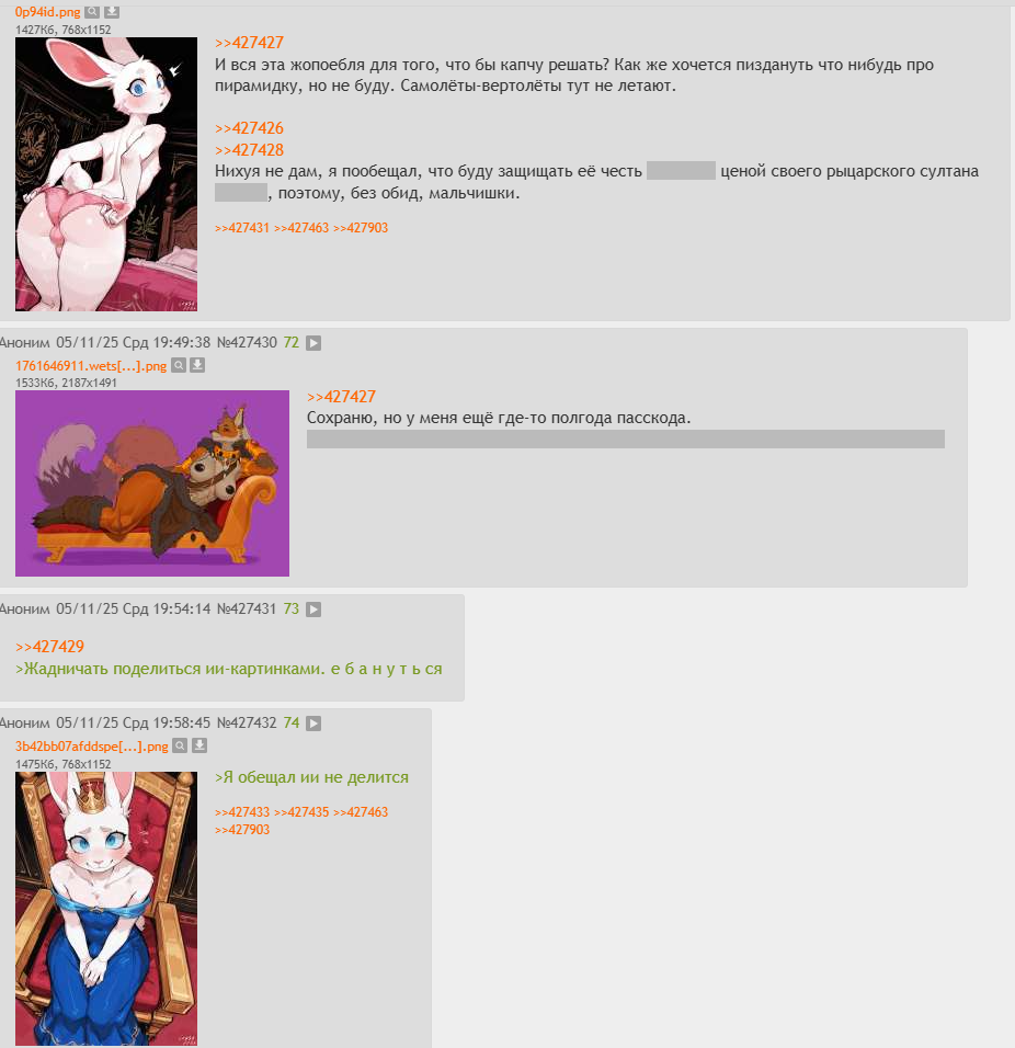 Также хотим напомнить, что любой контент (в том числе и сгенерированный AI), содержащий в себе половую связь между людьми и реалистичными (неантропоморфными, феральными, реально существующими) животными, нарушающий законодательство РФ, или содержащий в себе запрещенную символику, будет удаляться, а пользователь будет блокироваться.