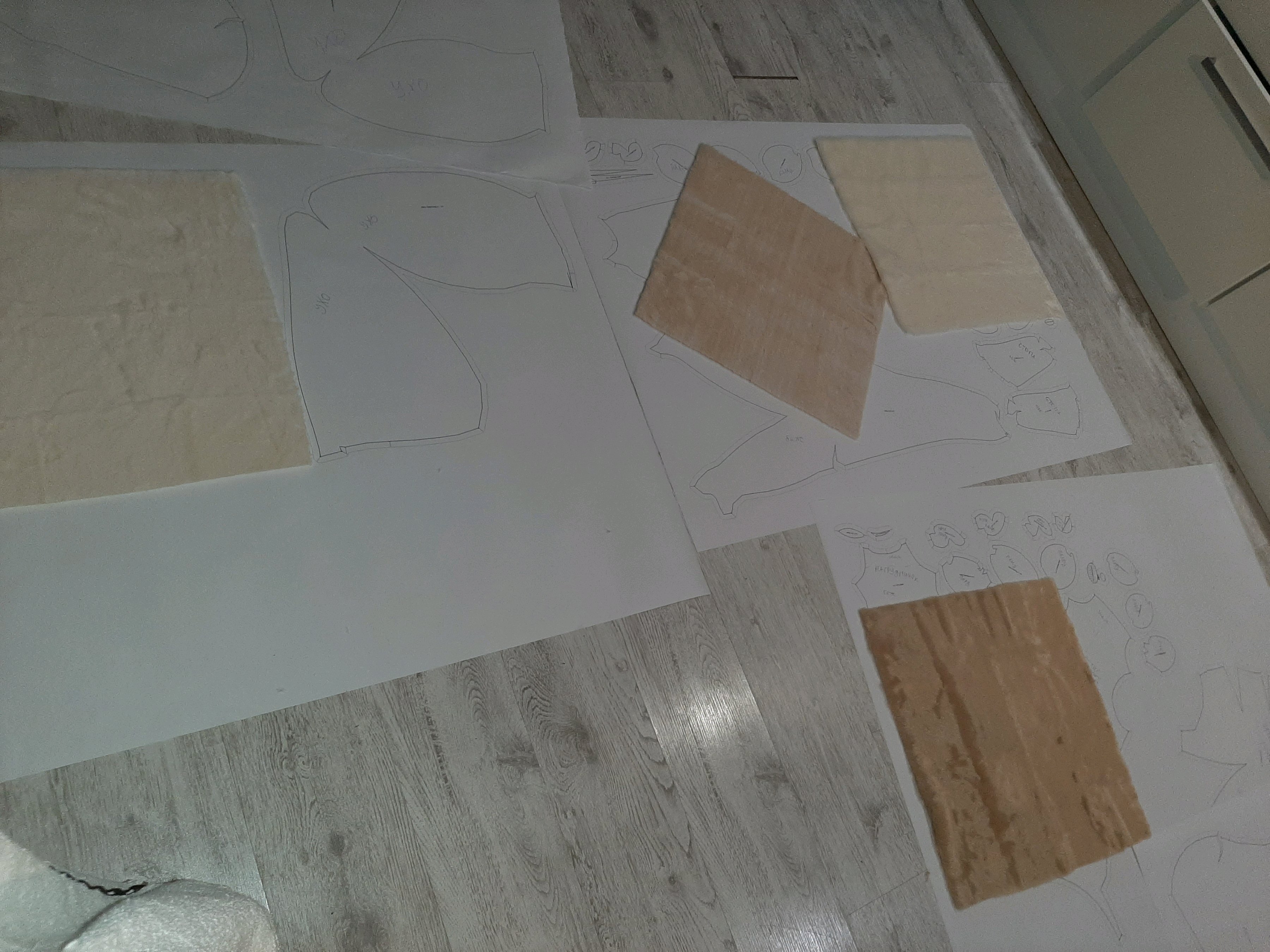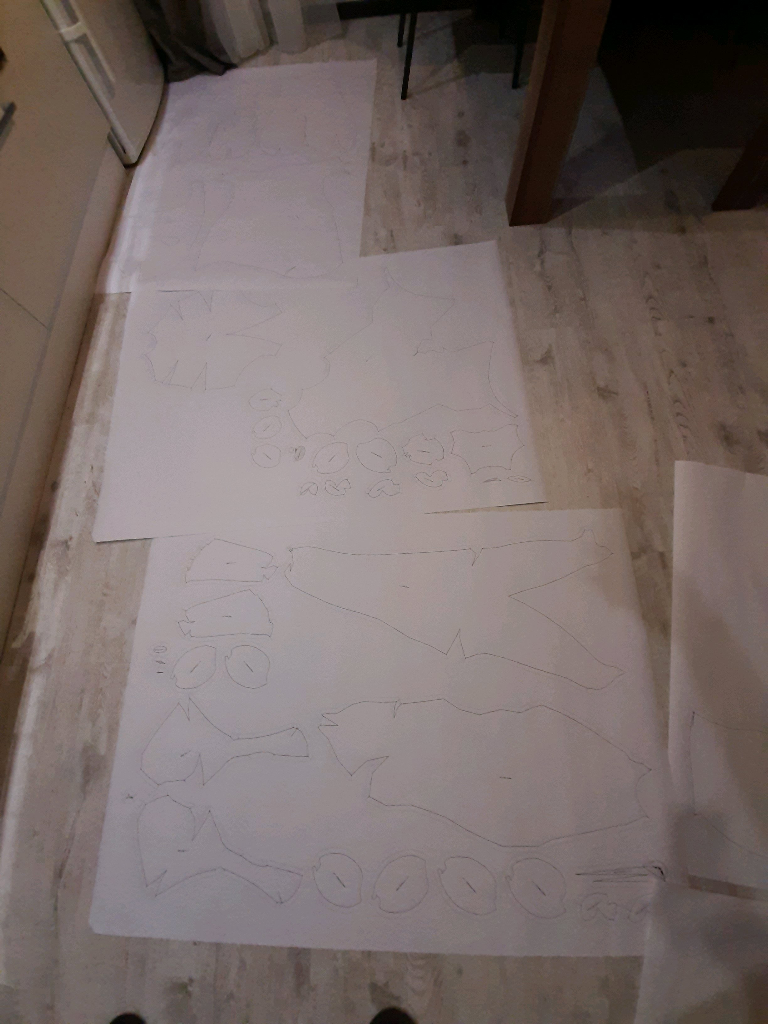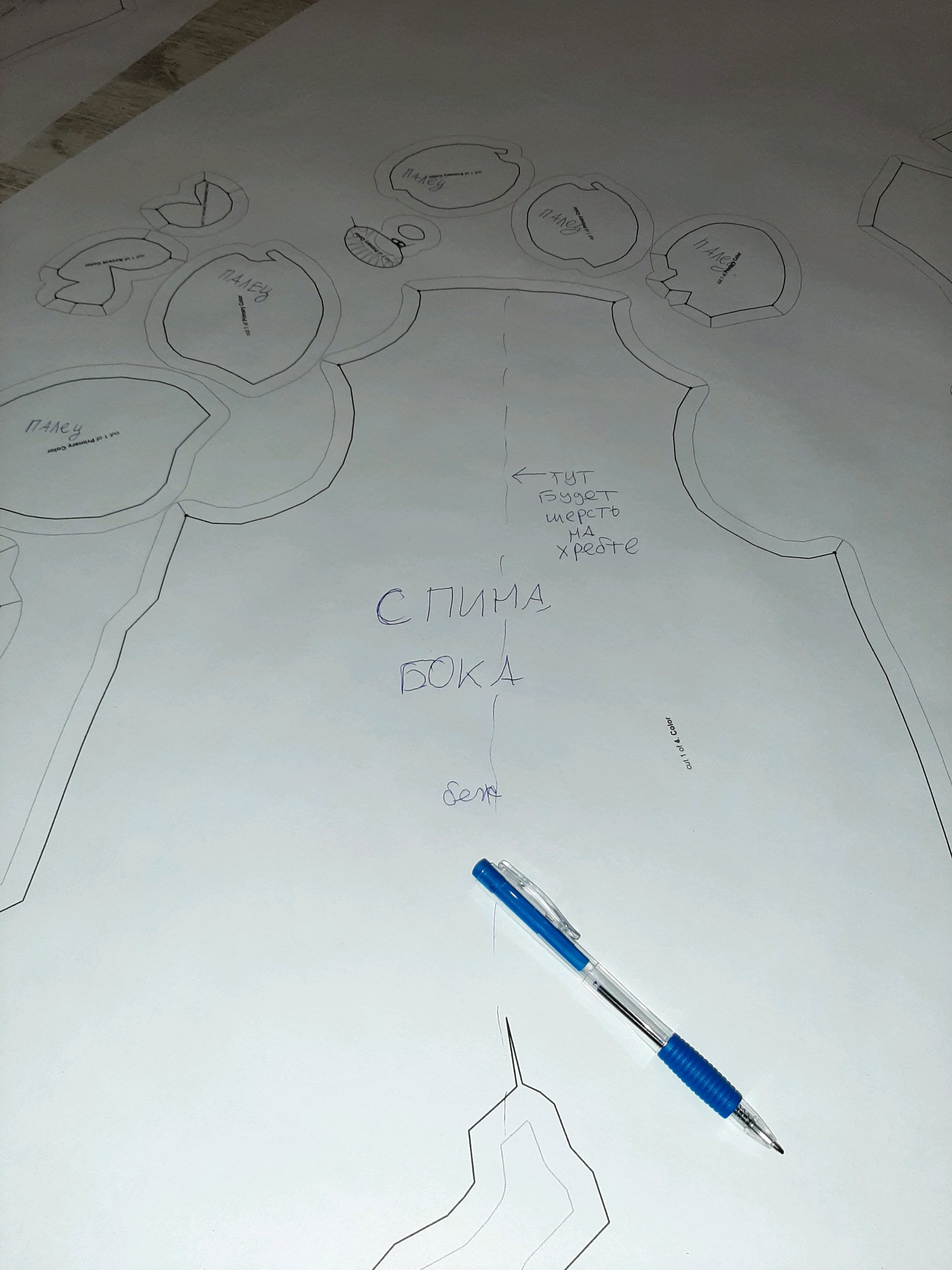 сегодня вырезал то что наразмечал. И попробовал снять раскройку с ноги. Нихуя не вышло. Очень сложная форма... Завтра еще раз попробую. Возможно придется менять или сильно упрощать лапы и голову. Видимо то что с трудом разрезает плюшифай так же с трудом и человек правильно разметит. Если вообще возможно сделать адекватнуб разметку, чтобы модель не была похожа на франкенштейна. Ну или материал другой брать - тянущийся какой-нибудь... но мне не нравится идея.