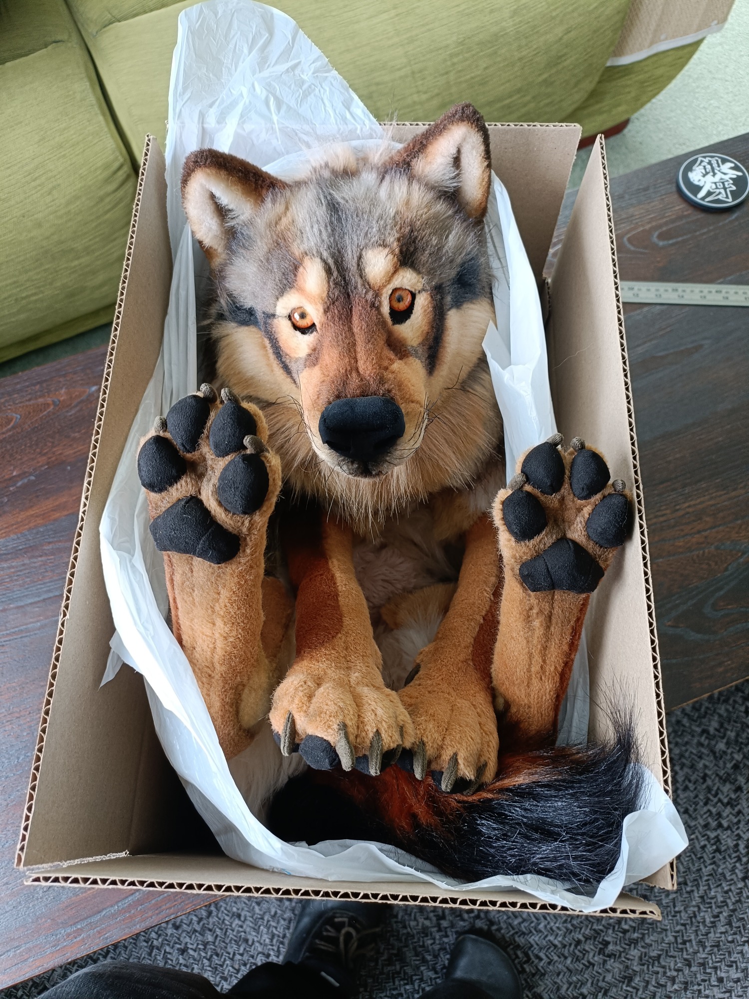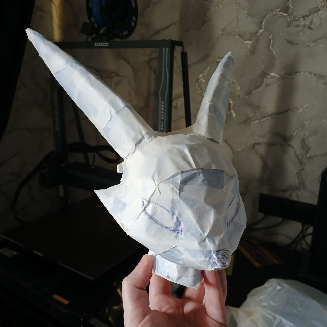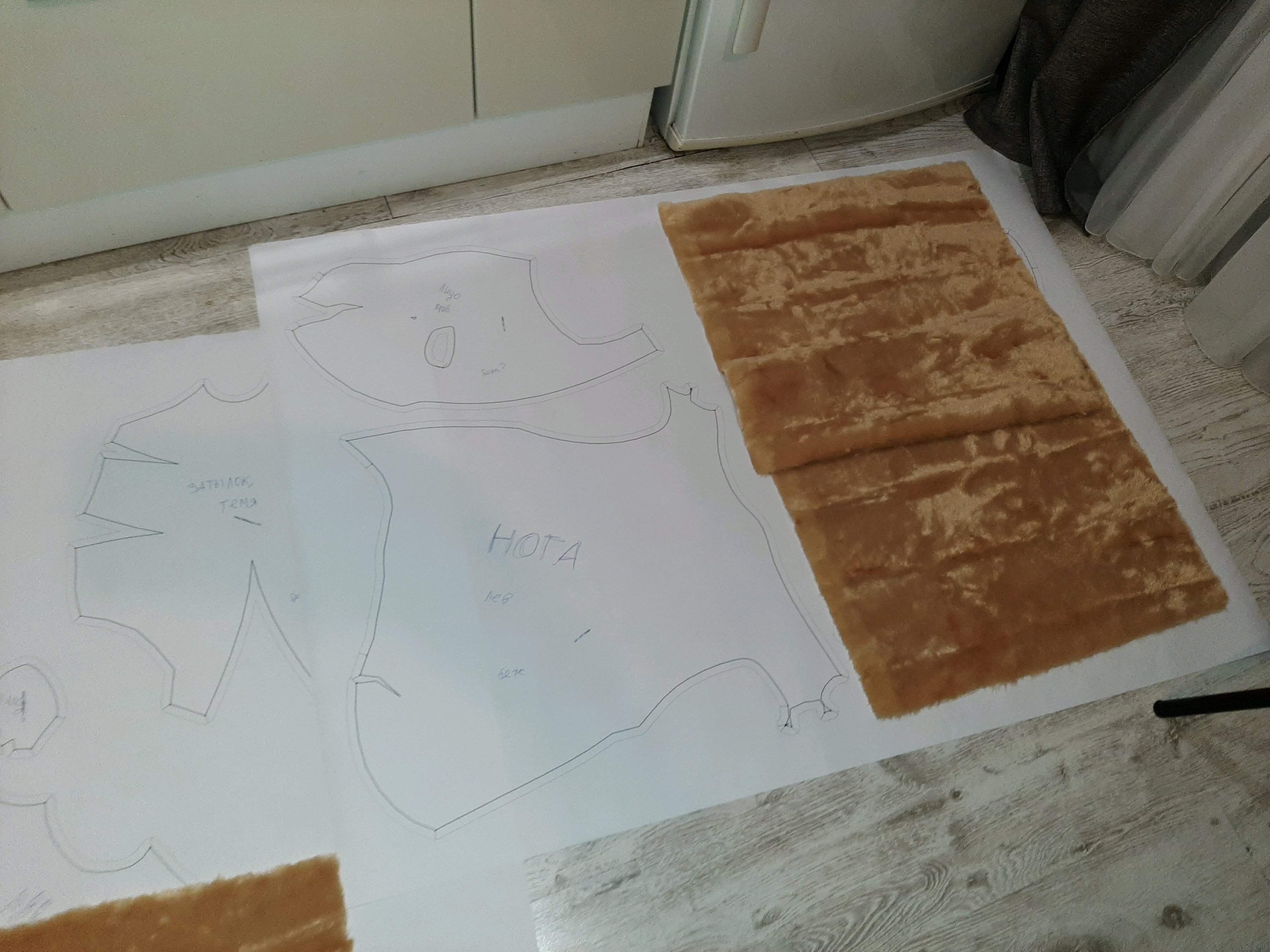 сегодня вырезал то что наразмечал. И попробовал снять раскройку с ноги. Нихуя не вышло. Очень сложная форма... Завтра еще раз попробую. Возможно придется менять или сильно упрощать лапы и голову. Видимо то что с трудом разрезает плюшифай так же с трудом и человек правильно разметит. Если вообще возможно сделать адекватнуб разметку, чтобы модель не была похожа на франкенштейна. Ну или материал другой брать - тянущийся какой-нибудь... но мне не нравится идея.