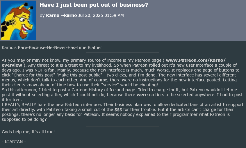 Длинно: заебало что интернет и аудиторию заинтересованную разметало по пачке разных сайтов и приходится лить на хотя бы часть из них (все равно штук пять минимум набирается, не считая патреона и дискорда), и при этом у каждого свой пизданутый интерфейс и правила. Кто-то вспомнит про постиберб, а я скажу что он половине нужных мне сайтов не работает, а другая половина регулярно хочет перелогина, блжад.