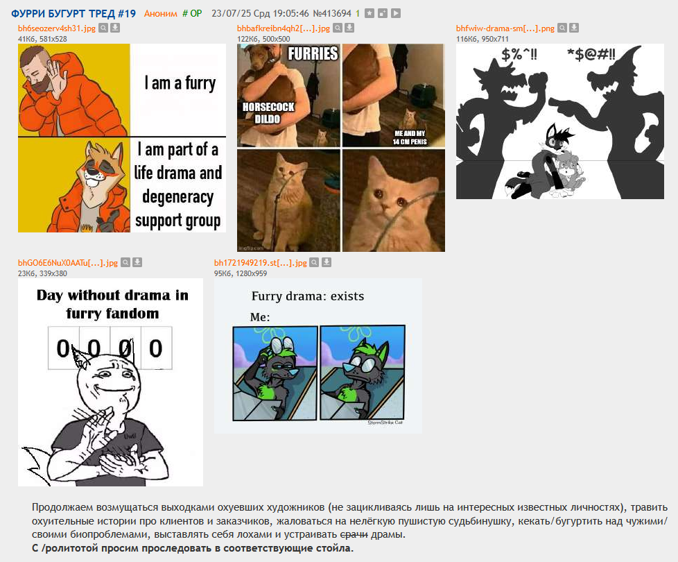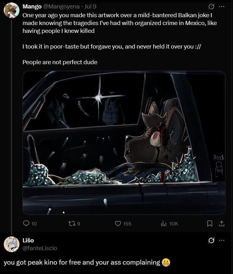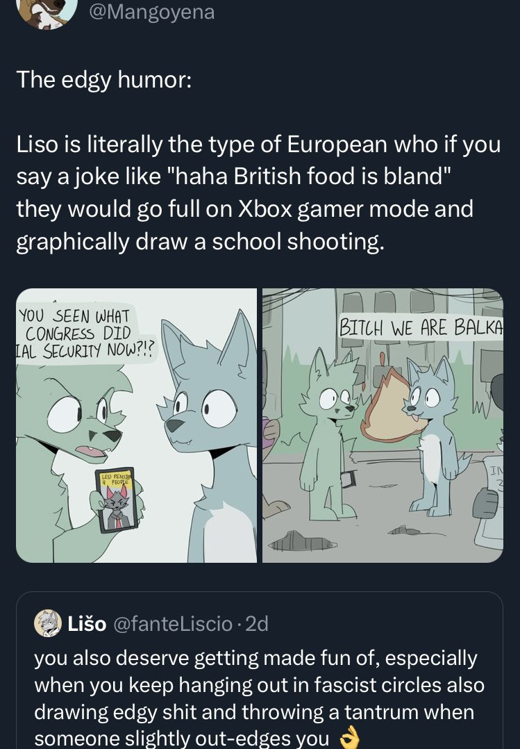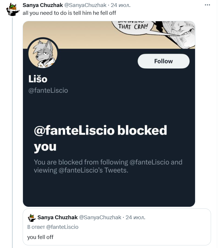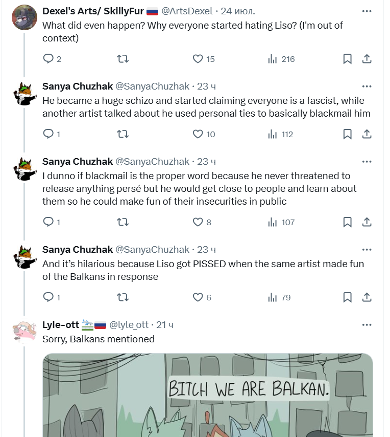 Тонкая славянская фурри-душа. Интересно, стоит ли выносить твиттерские драмы сюда? А то в них черт ногу сломит, там еще минимум 2 ветки. Если вкрации чел по кличке Лисо бомбит, что кто-то не уважает чужое горе, ему намекают, что у него моральные качества тоже невысоки, например он может нарисовать другого фурря мертвецом из-за якобы неуважительной шутки про его родину (он хорват).