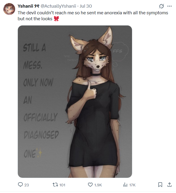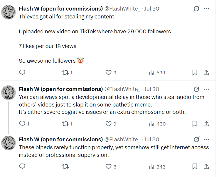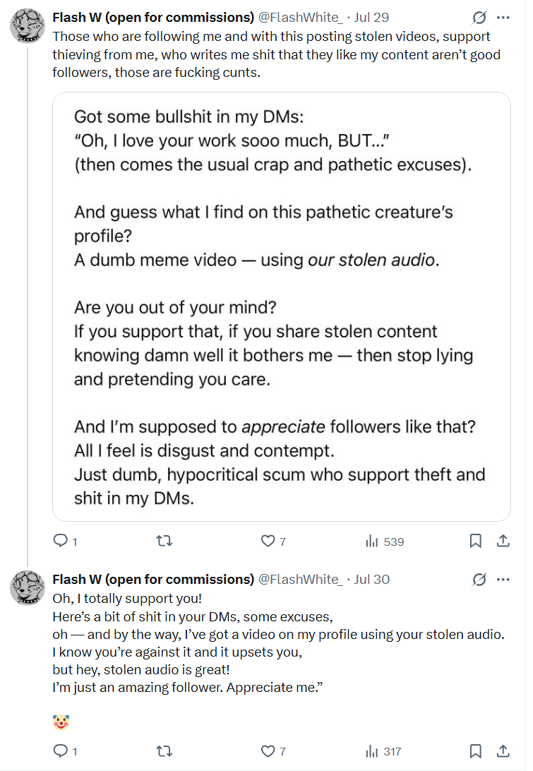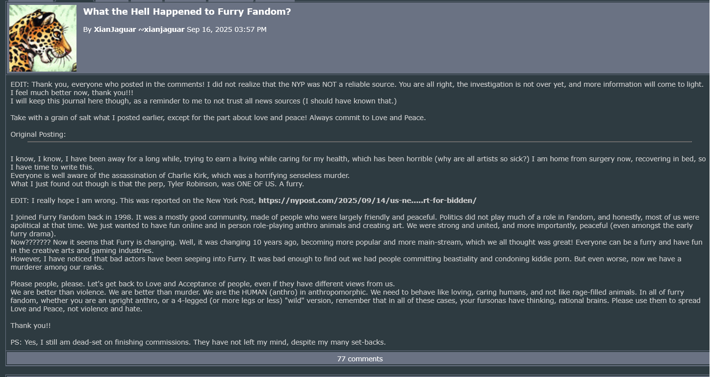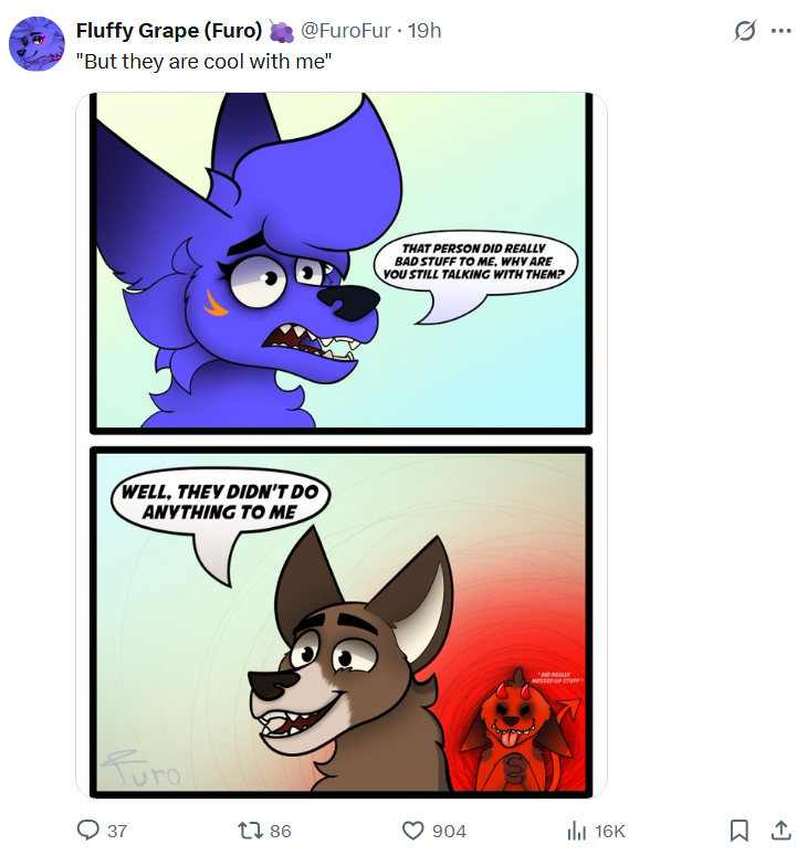 Тонкая славянская фурри-душа. Интересно, стоит ли выносить твиттерские драмы сюда? А то в них черт ногу сломит, там еще минимум 2 ветки. Если вкрации чел по кличке Лисо бомбит, что кто-то не уважает чужое горе, ему намекают, что у него моральные качества тоже невысоки, например он может нарисовать другого фурря мертвецом из-за якобы неуважительной шутки про его родину (он хорват).