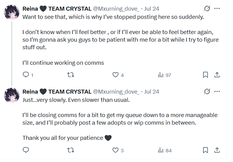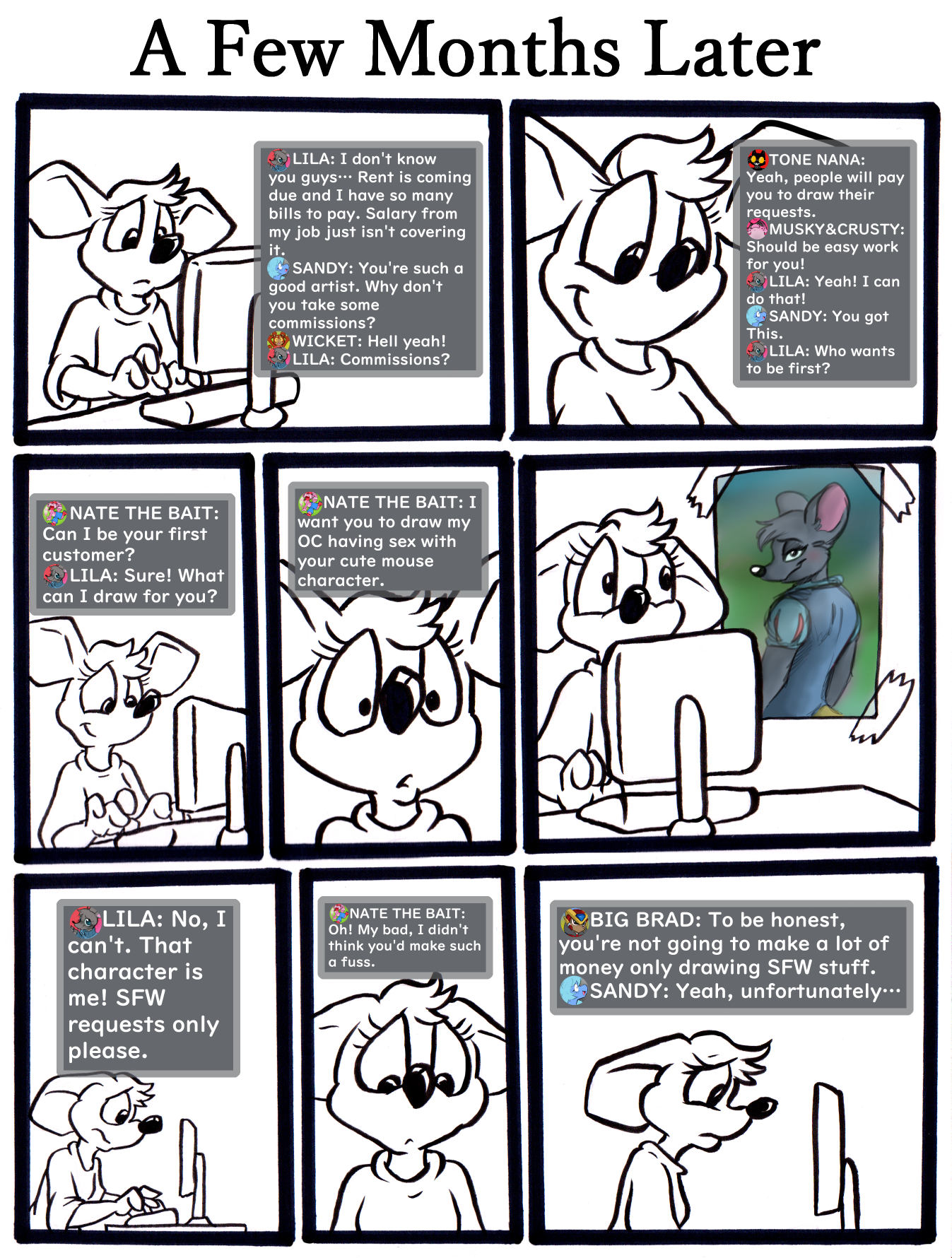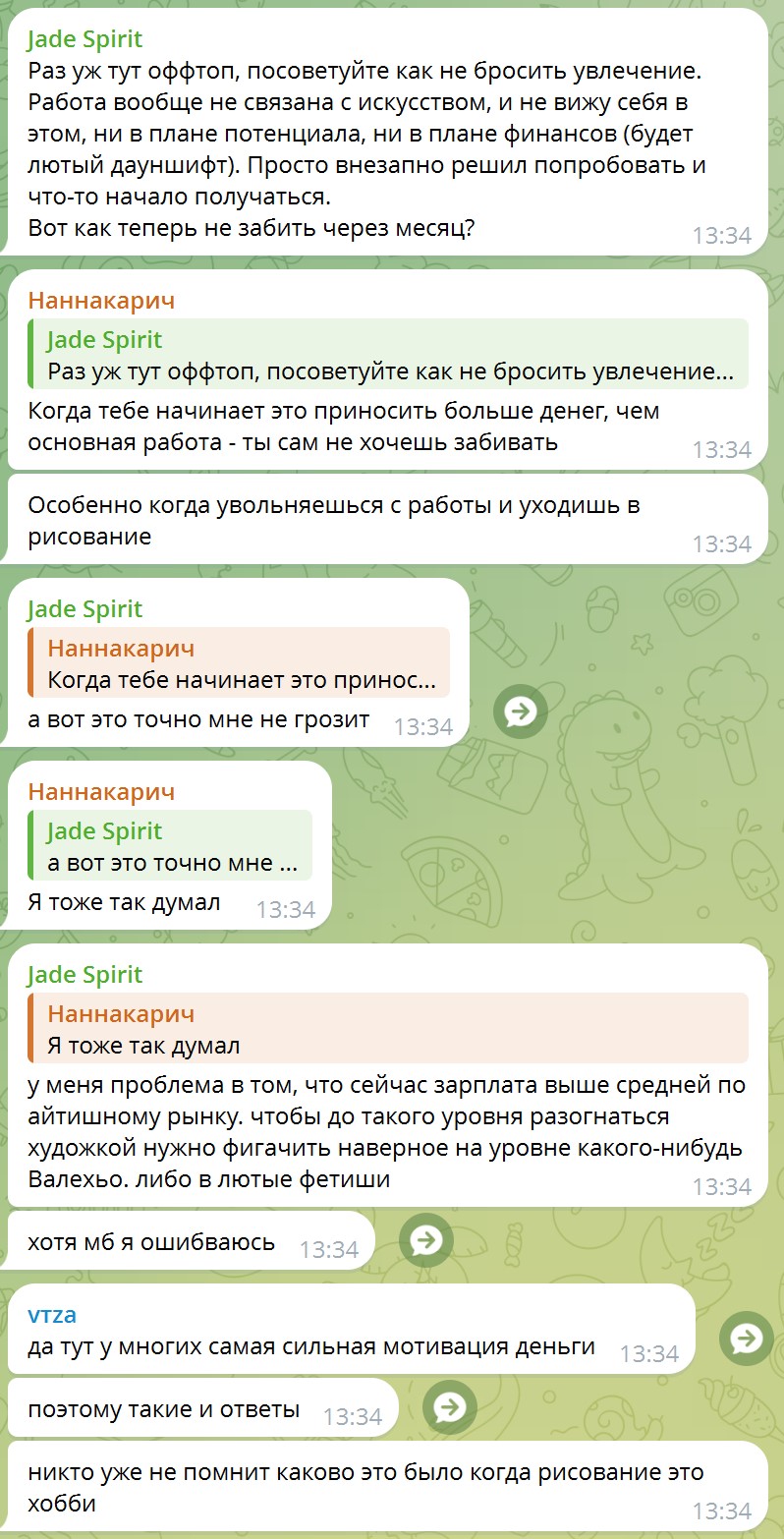 То есть я один проживу, но приятнее иметь дополнительные деньги. Если у меня пропадёт такая возможность - ну что ж, C'est la vie. Тогда я буду рисовать исключительно для себя, а реквестов и трейдов не было и не будет.