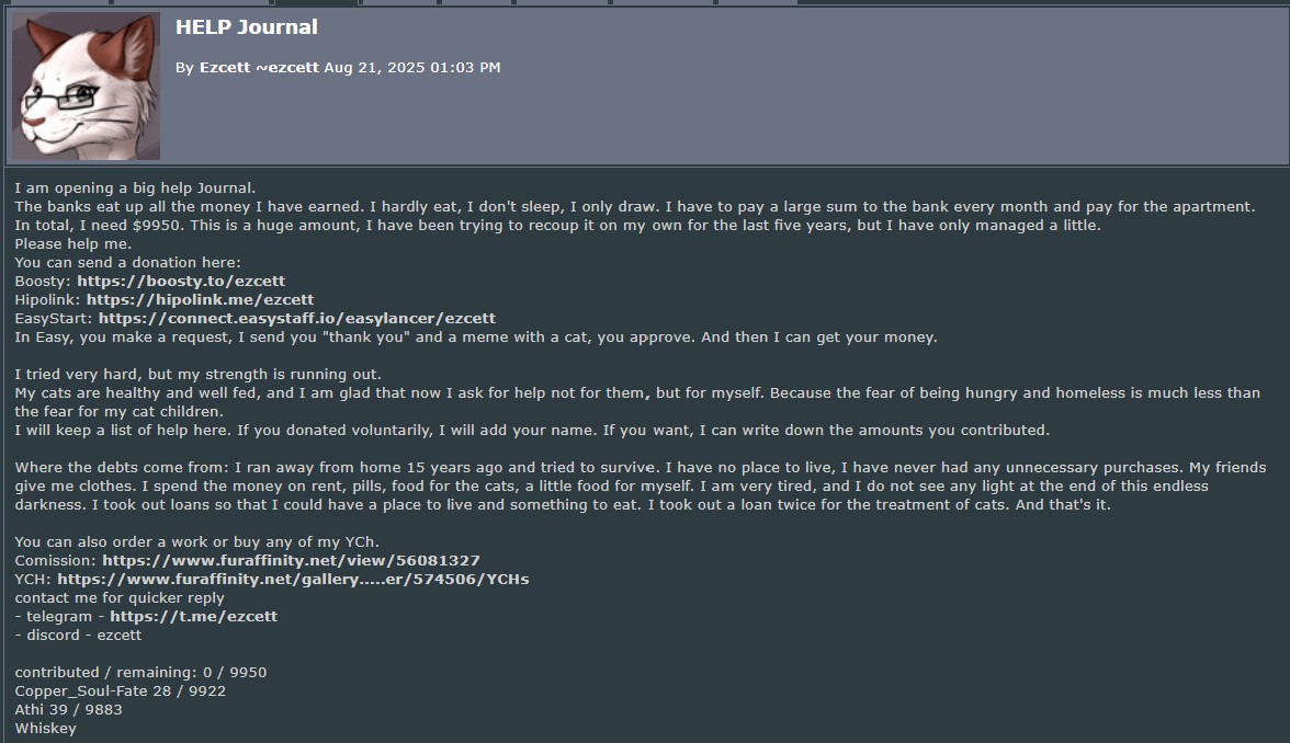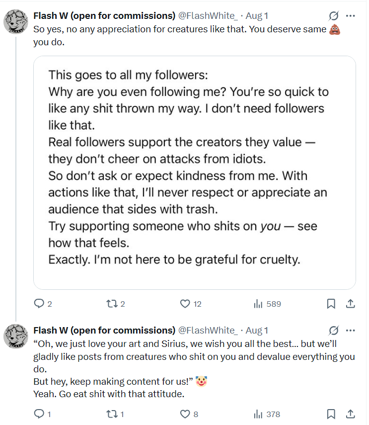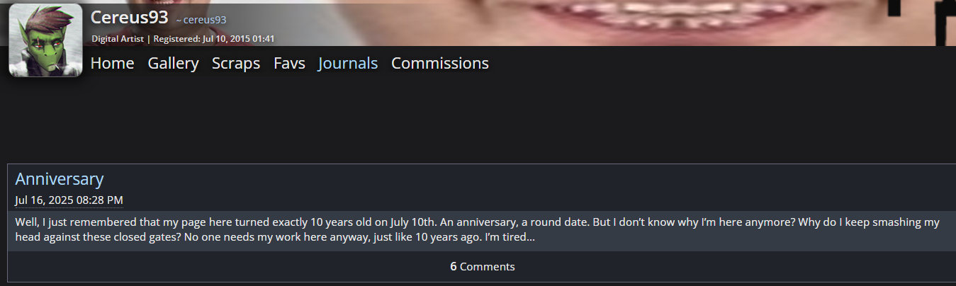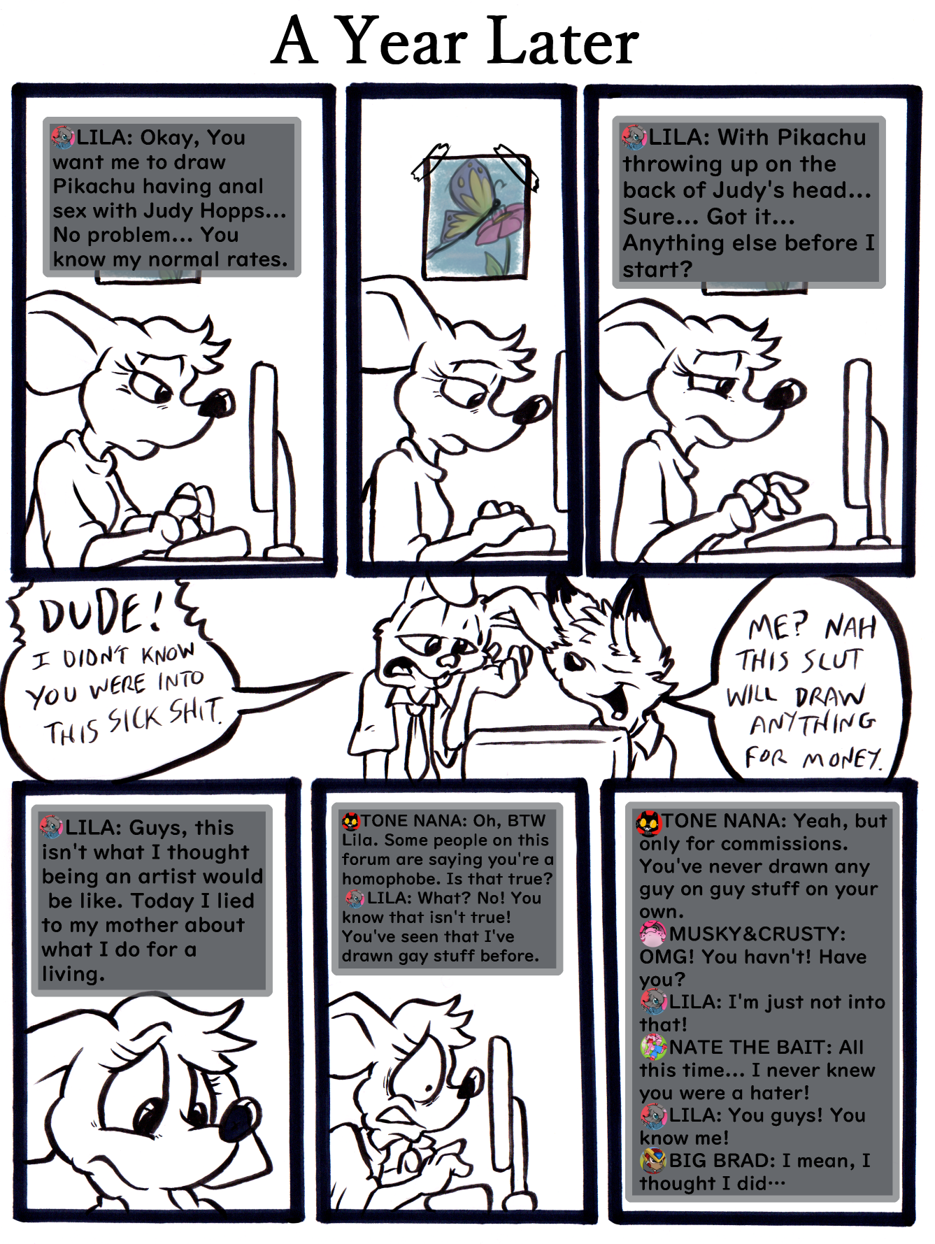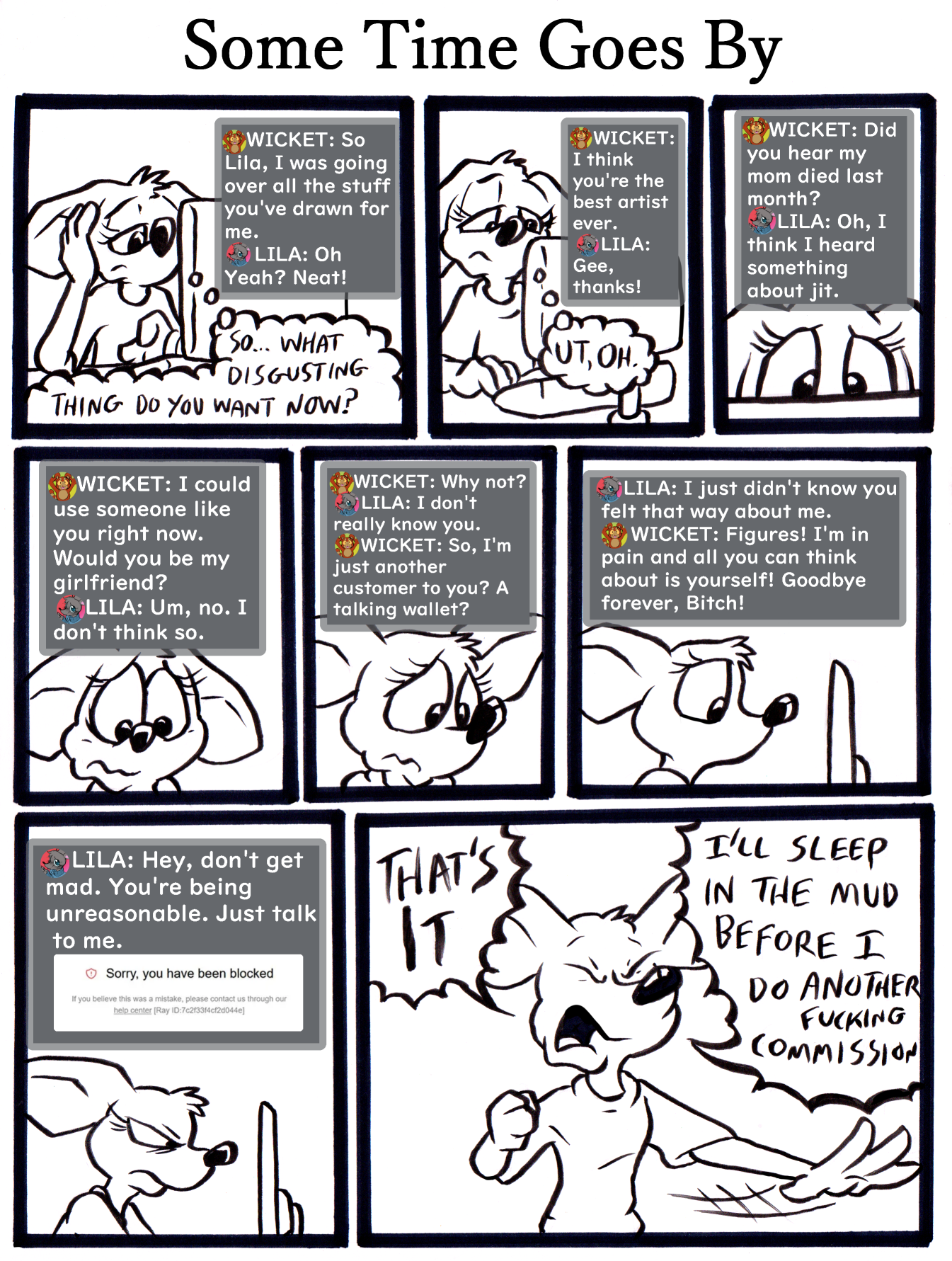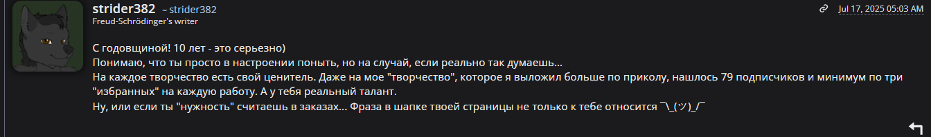 Будучи насквозь барыгой, чей мозг подвергся психдеформации, ты физически не можешь понять, что есть люди, которые могут разделить со мной мечты и архетипы. Не все рисуют только ради денег. Для тебя фурри - работа, для нас - любовь, мы на разных уровнях.
