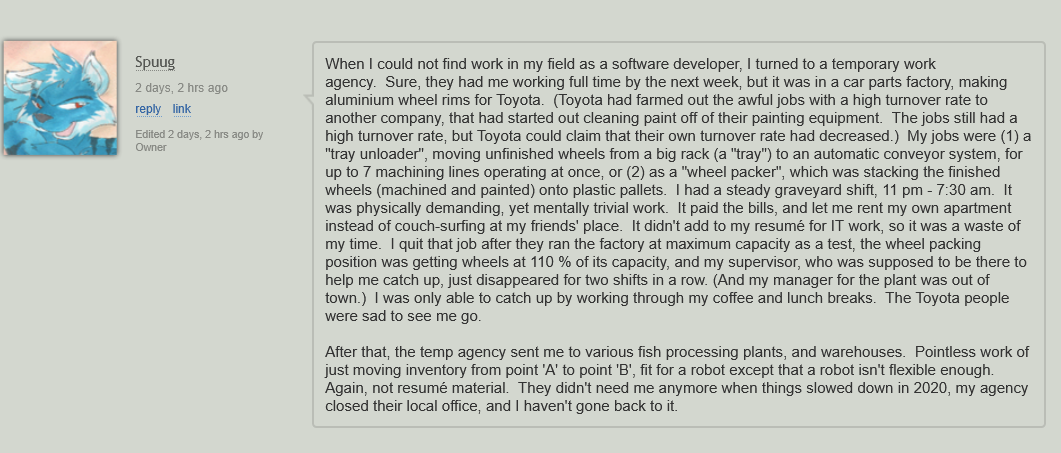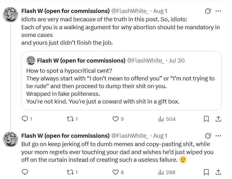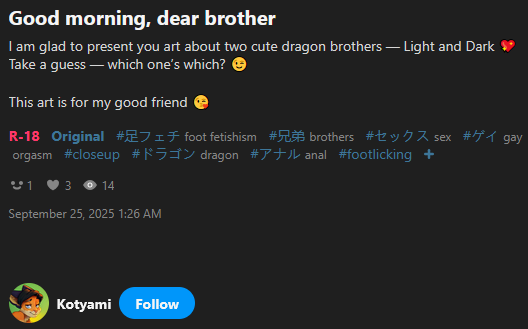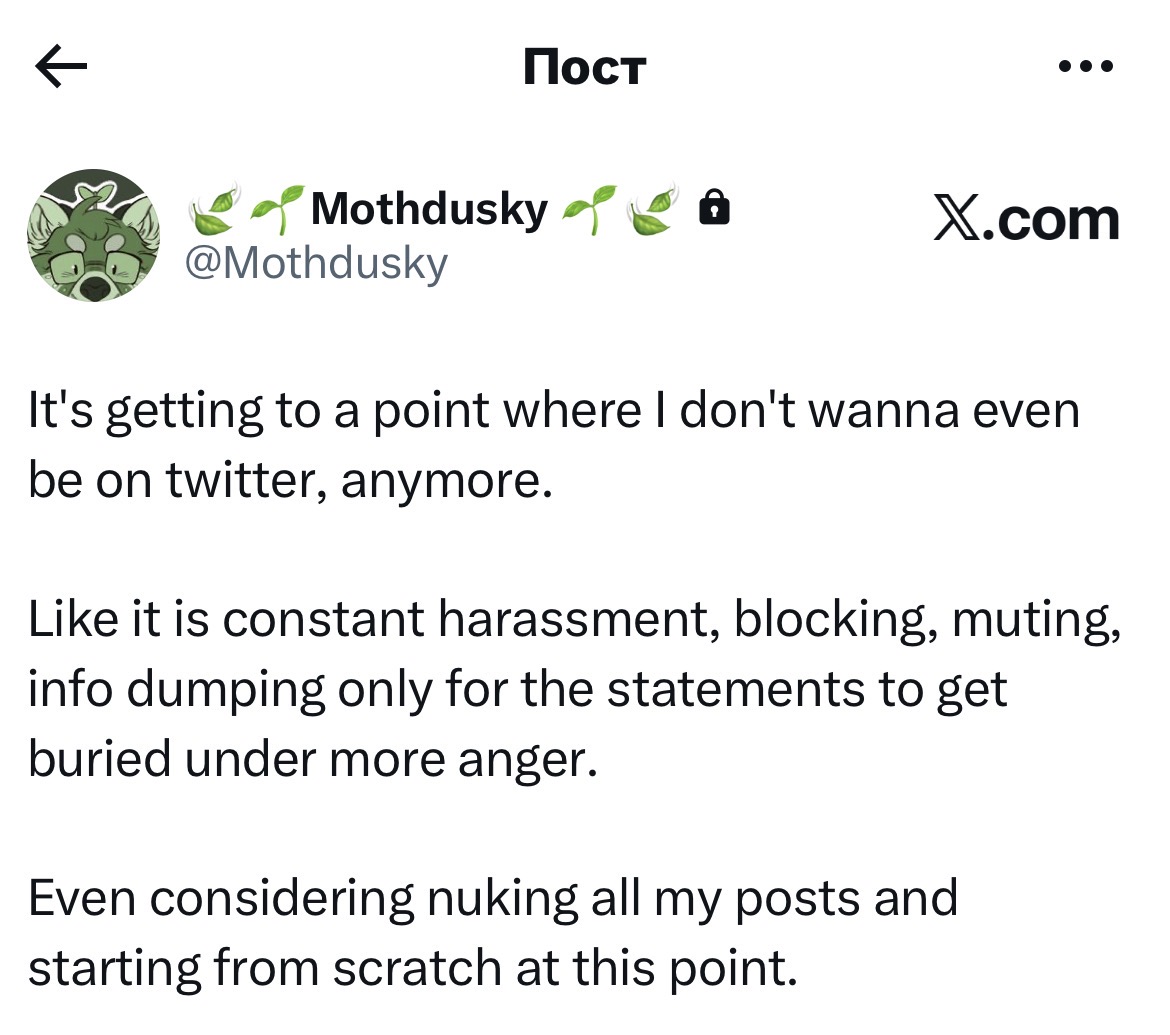 >>427824 Уж не знаю чего ты там творишь со своей проксёй и фингерпринтнутым браузером. Я вкатися в блюсик достаточно рано, когда ещё были инвайты полгода сидел в wait-листе и ждал свой заветный, и когда мало кто вообще мог там регистрироваться, так что массовый exodus с Х пока ещё не начался. Перекатился вслед за особо радикальными художниками, которые ещё и свою учётку на X неосмотрительно снесли, после чего их %USERNAME% быстро закиберксвотили всякие скаммеры. В целом мог бы закатиться обратно на X, если бы там пару месяцев назад не ввели анальные возрастные ограничения с обязательным документальным подтверждением благо есть Xcancel и подобные альтернативыне фронтенды вроде Nitter, с этим не так всё плохо