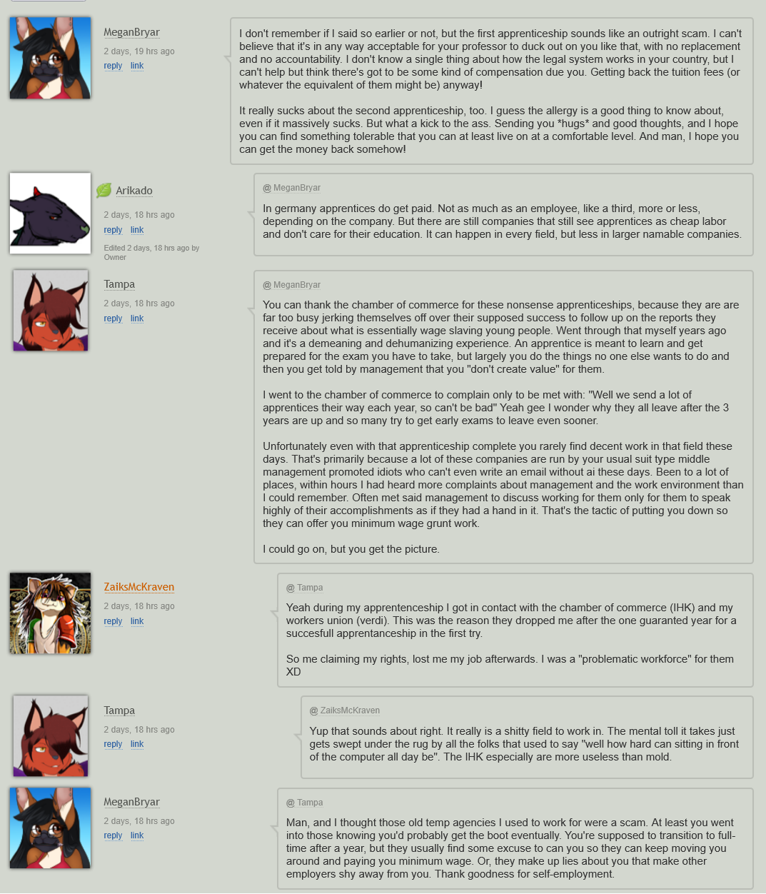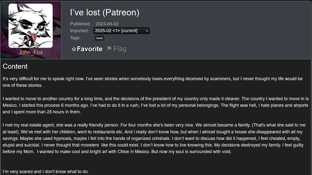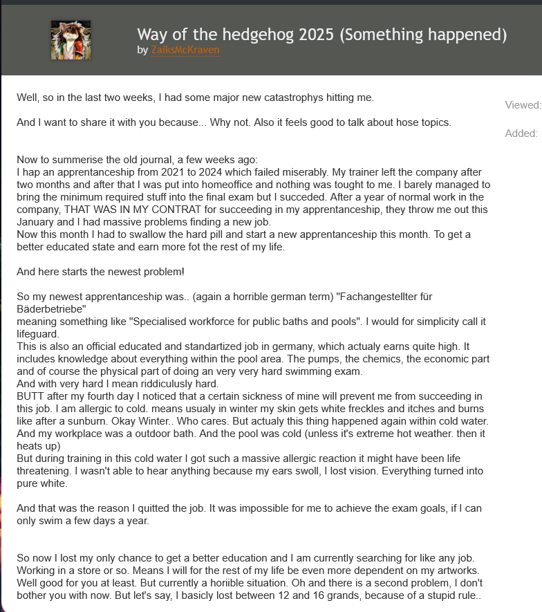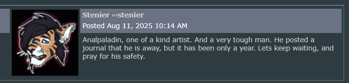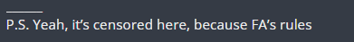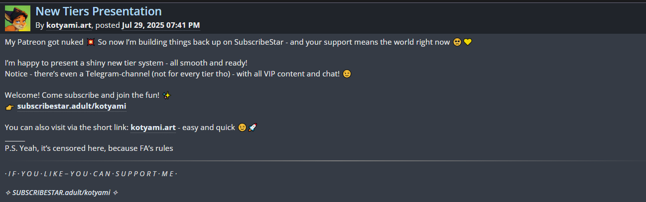 >>424212 В отличии от FA, тут из админов вообще скорее всего только один Toumal за всё отдувается. Ладно хоть FSE с зеркалом рассказов SoFurry работает, а то когда бы я ещё дочитывал рассказы, давно лежащие в закладках.