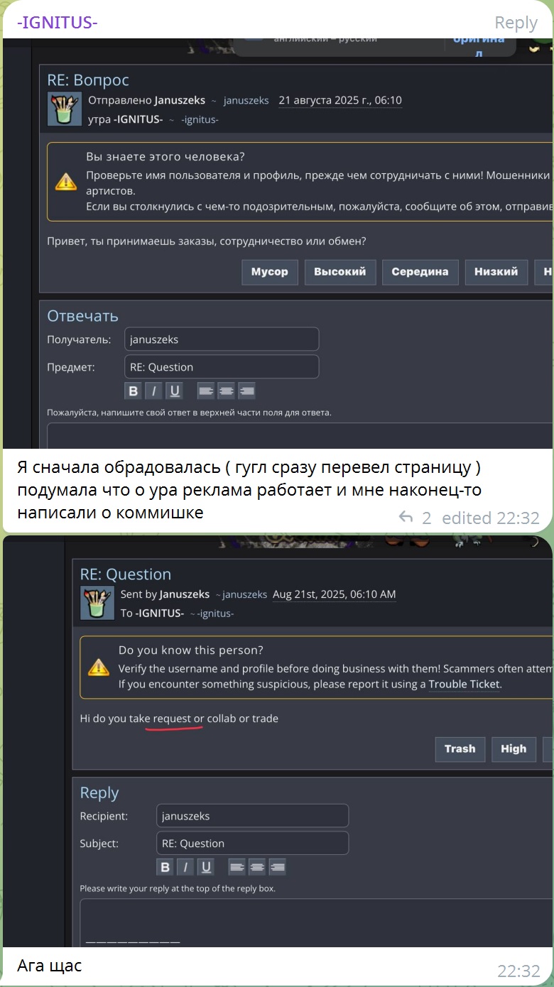 >>414330 У тебя "попросили" и "потребовали" тождественные понятия? Искренний пчел на просьбу, если она ему неинтересна, ответит мягким отказом, не задевая больных мозолей пишущего. Барыга же зайдётся истошным криком. "Да как ты, плебей, посмел написать мне, великому, со своей ничтожной просьбой?!"