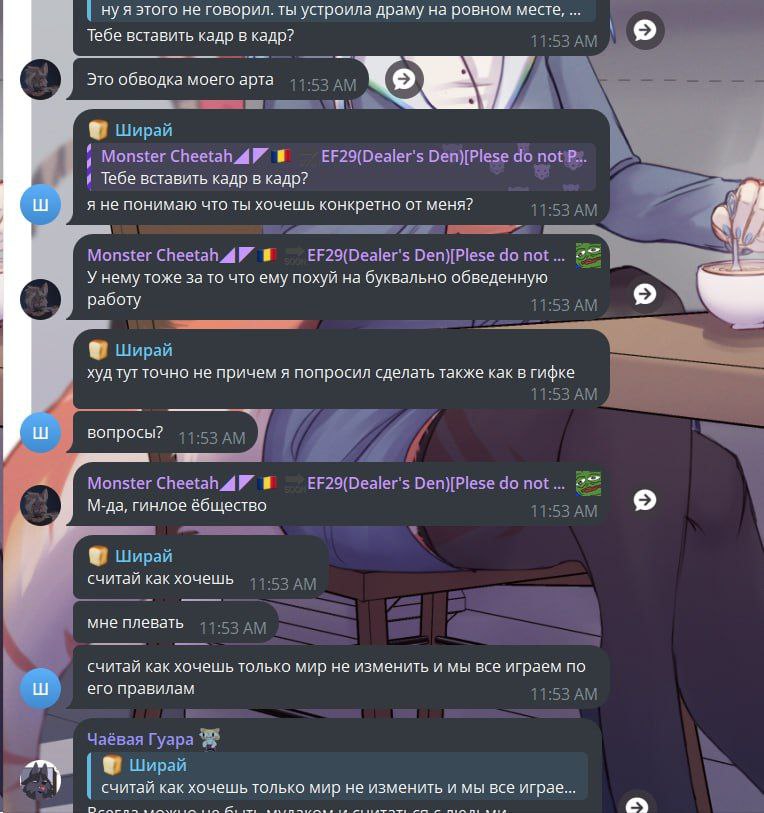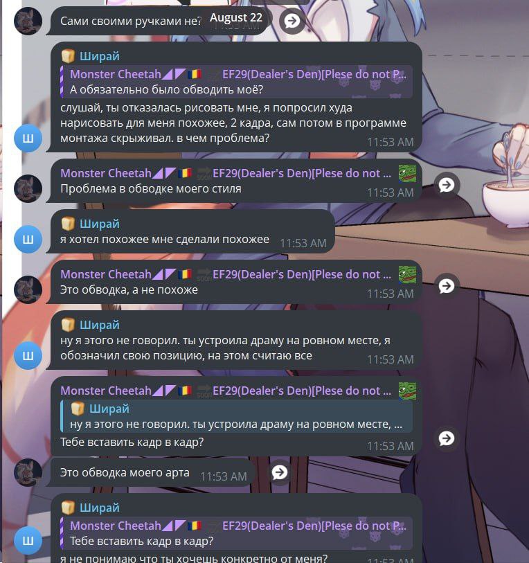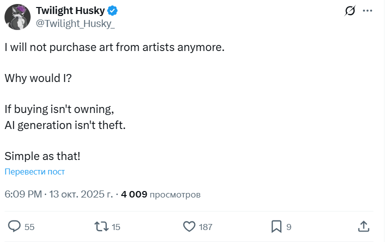 УВАЖАЕМЫЙ ХУДОЖНИК, ВЫ ЧТО, ГЕНЕРИТЕ СВОИ АРТЫ НЕЙРОСЕТЬЮ И ПРОДАЕТЕ ИХ МНЕ ПО ФУЛЛПРАЙСУ РУЧНОЙ РАБОТЫ? @ ТЕХНИЧЕСКИЙ ПРОГРЕСС НЕУМОЛИМ! С ТЕБЯ 100500 ДОЛЛАРОВ, ДОРОГУША! @ ПОШЕЛ НАХУЙ, БАРЫГА, Я САМ ОБРАЩУСЬ К НЕЙРОСЕТИ! @ РЕЕЕЕ ЗАПРЕТИТЬ НЕЙРОСЕТИ! ОНИ ОТНИМАЮТ ЧЕСТНЫЙ КУСОК ХЛЕБА У БЕДНОГО ХУДОЖНИКА! БЕЗДУШНЫЙ НЕЙРОСЛОП!