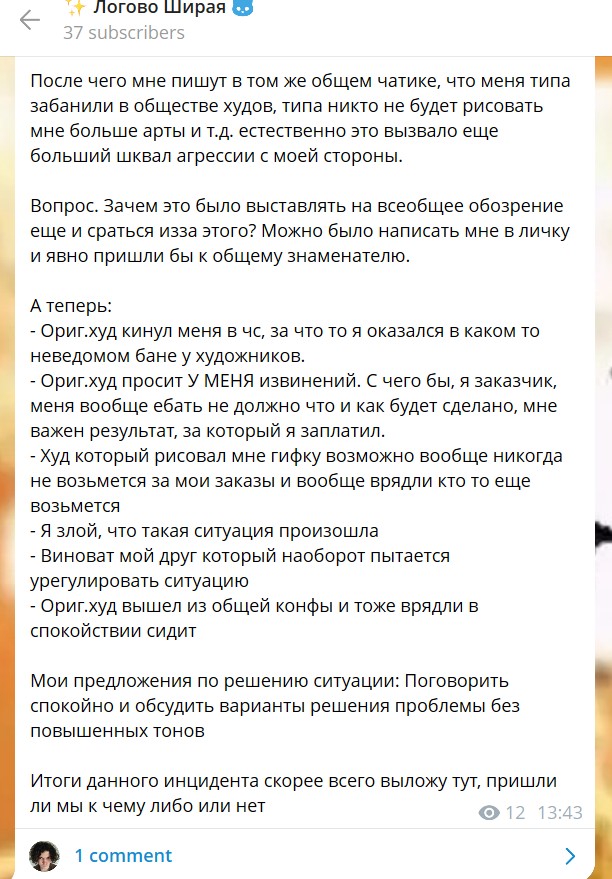 Продолжаем возмущаться выходками охуевших художников (не зацикливаясь лишь на интересных известных личностях), травить охуительные истории про клиентов и заказчиков, жаловаться на нелёгкую пушистую судьбинушку, кекать/бугуртить над чужими/своими биопроблемами, выставлять себя лохами и устраивать срачи драмы. С /poлитотой просим проследовать в соответствующие стойла.