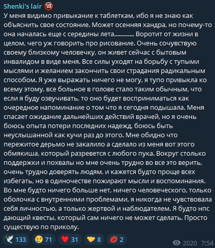 Если в первом состоянии высрусь на дваче, кукуху поотпускает, начинаю воспринимать свои проблемы проще и адекватнее.
