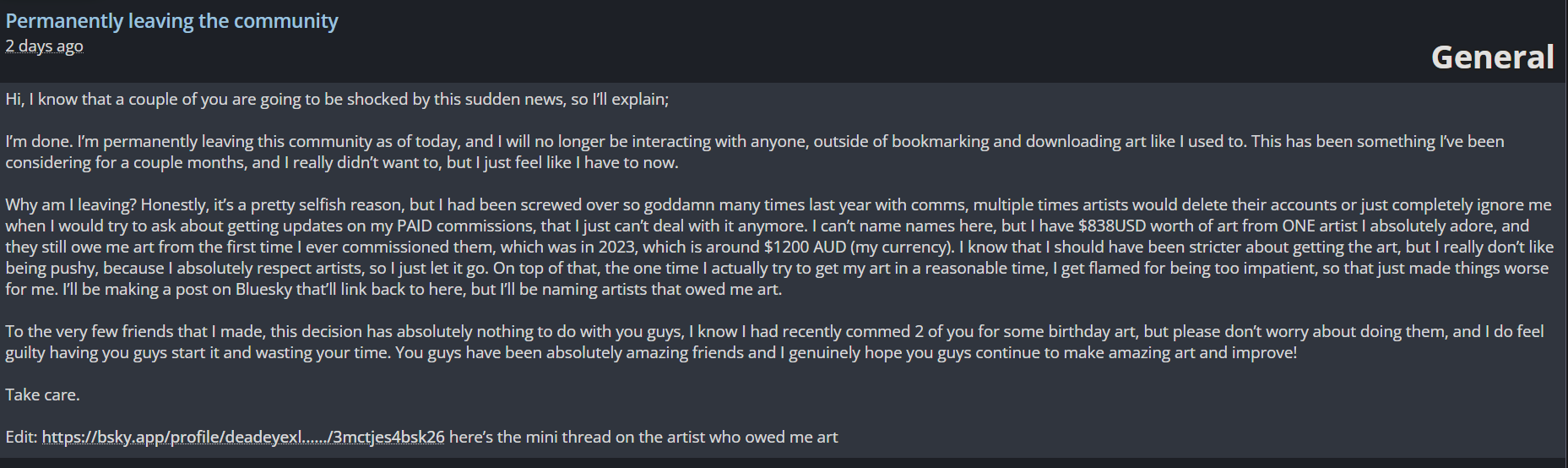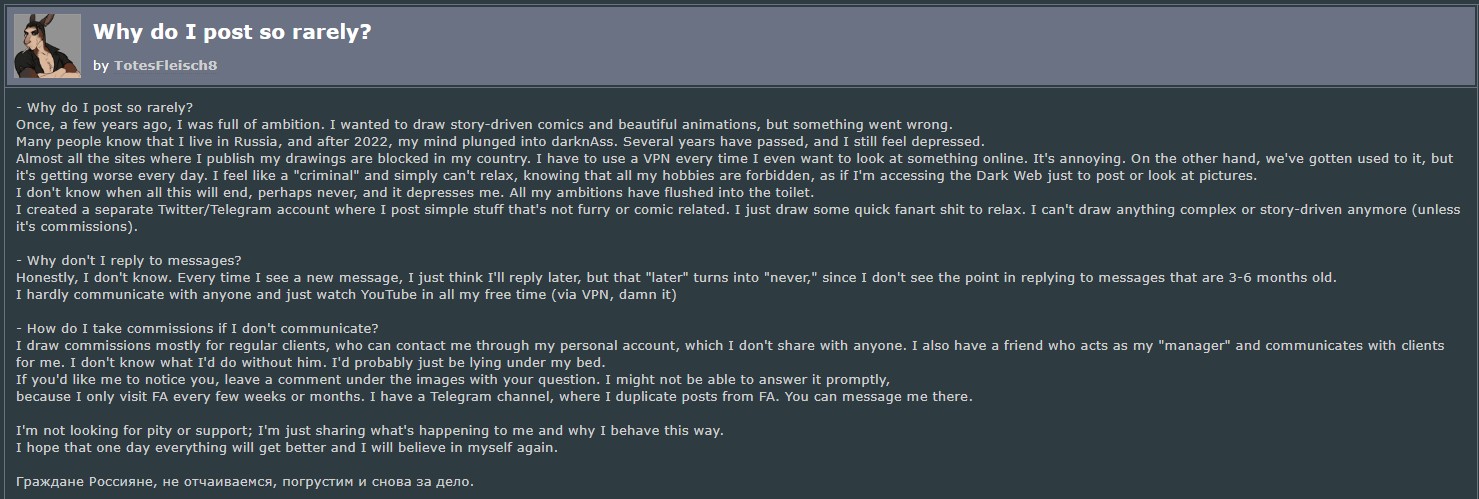 Продолжаем возмущаться выходками охуевших художников (не зацикливаясь лишь на интересных известных личностях), травить охуительные истории про клиентов и заказчиков, жаловаться на нелёгкую пушистую судьбинушку, кекать/бугуртить над чужими/своими биопроблемами, выставлять себя лохами и устраивать срачи драмы. С /poлитотой просим проследовать в соответствующие стойла.
