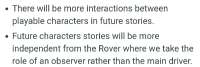 На Реддите опять истерика...кто-то неправильно перевел слова Солона, будто стиль будущего сюжета будет больше похож на Хоровод, где Ровер это наблюдатель, и истории персонажей происходят без его участия. В итоге там началась война что не дай бог сюжет станет менее ML