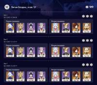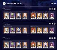 Текущая бездна какой-то простой показалась, с 1го захода всё пробежал. На 12м этаже в первой половине пачка Елань-Нахида-Фурина-Куки, во второй половине Райден-Сара-Дед-Беннет