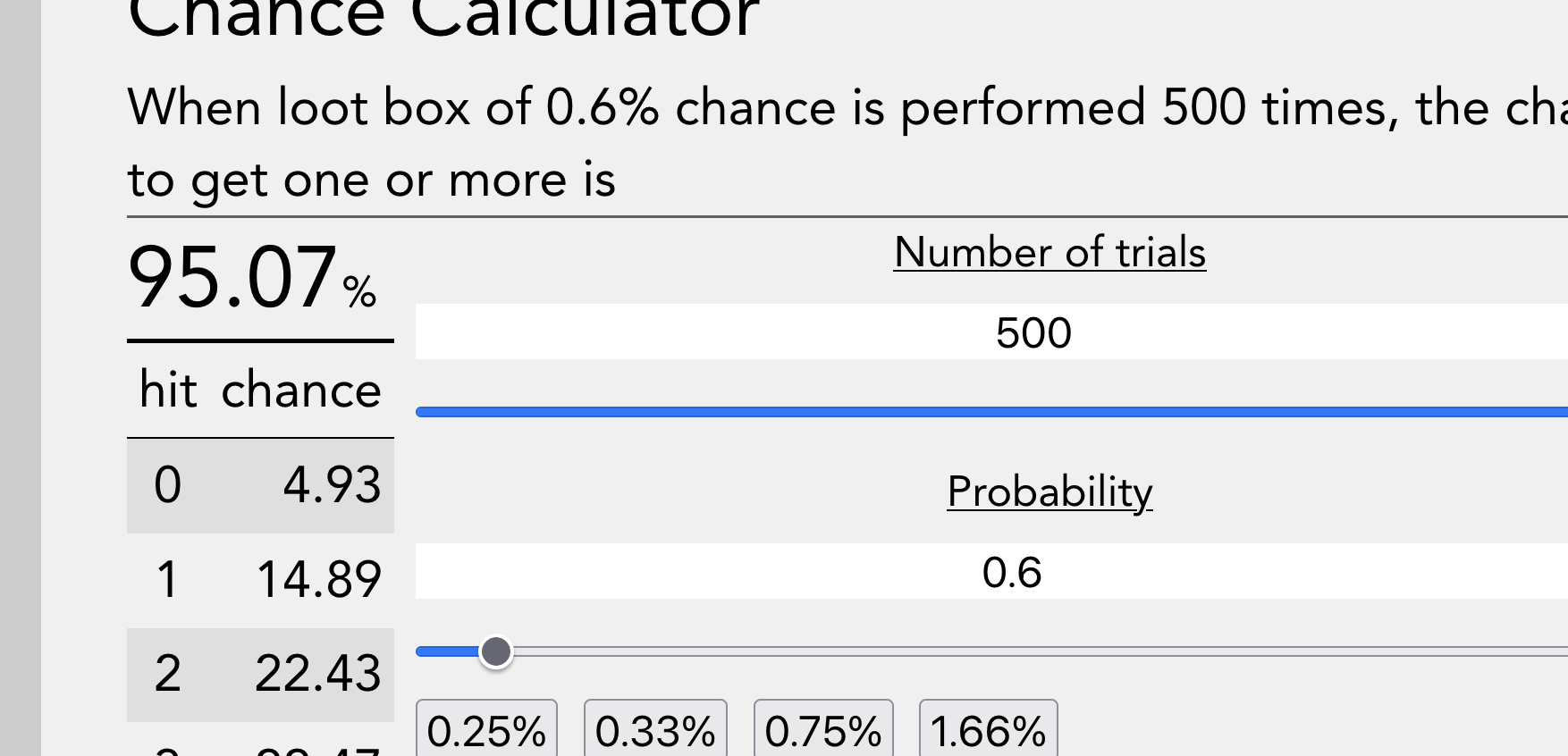 Сколько ящиков надо примерно открыть, чтобы кошку получить? Я просто мотемотику прогуливал, поясните пожалуйста за формулу. Шанс там вроде 0.6 но без гаранта