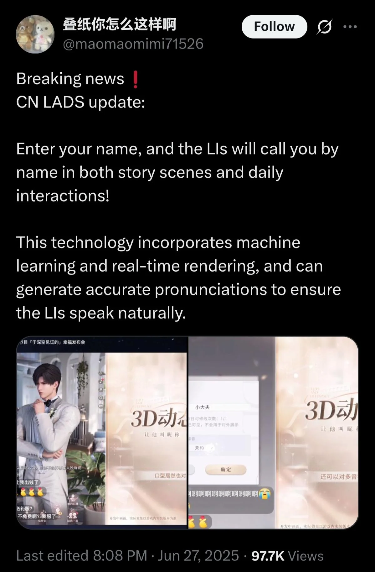 Там это, в Ладс добавляют свадьбу в некст патче и машин лернинг, чтобы ЛИ называли тебя по имени собственному голосом. Ждем когда Давей спиздит обе фичи.