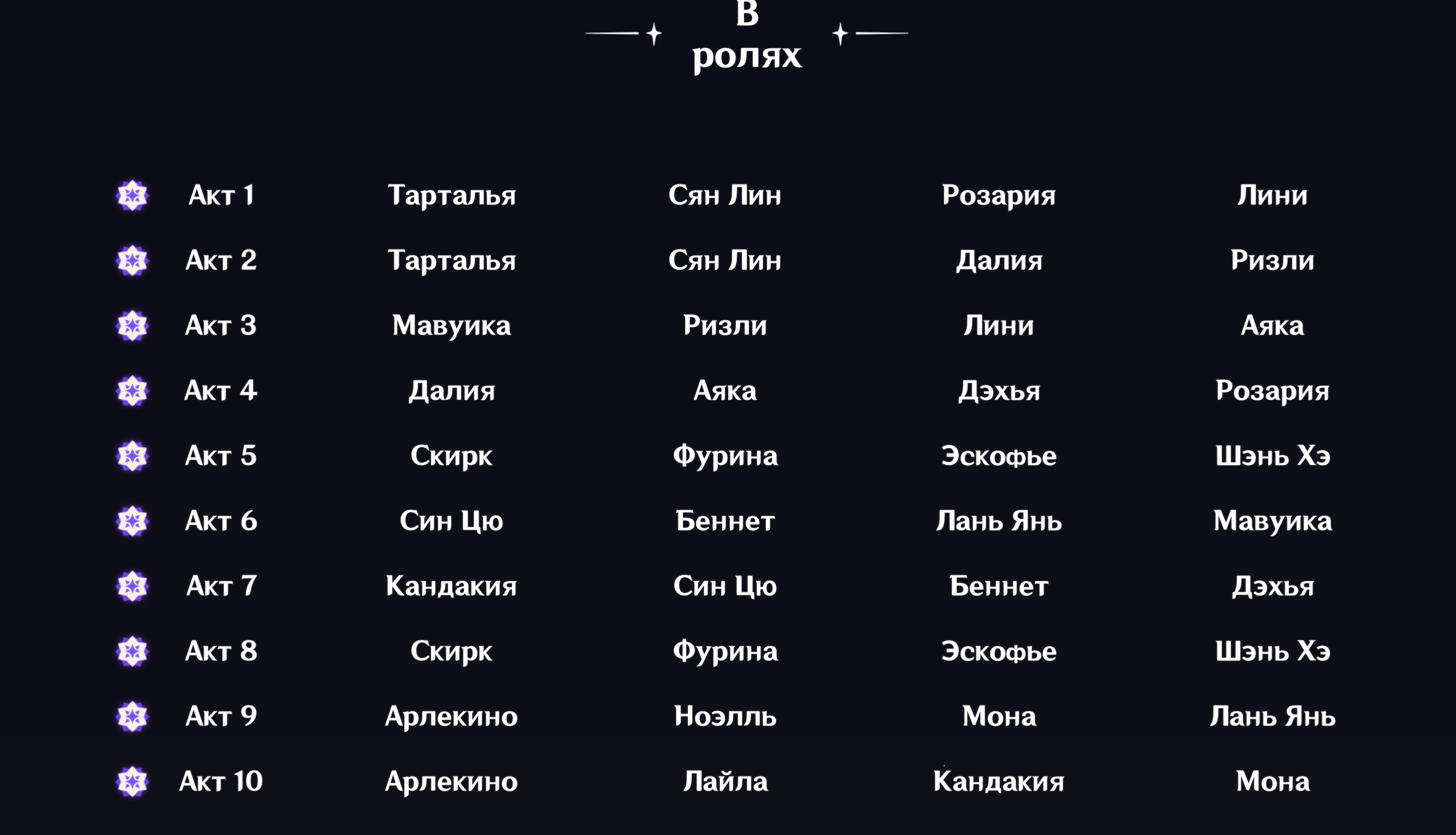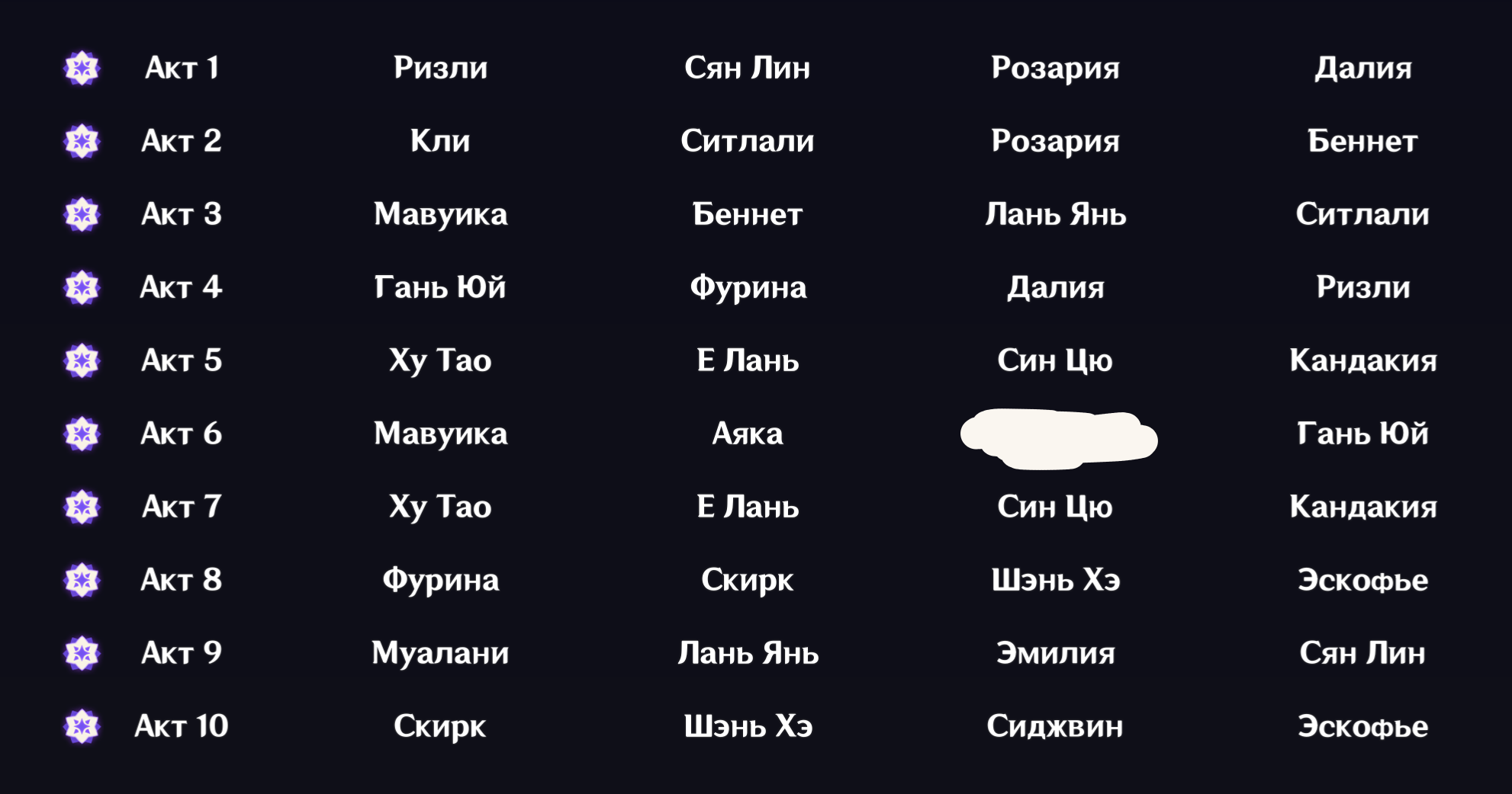 На самом деле, ещё вчера понял, что дело пахнет керосином и давка как раз таки будет в начале, на финал-то предсказуемые Фурины с Скирками, а вот в начале. Например, скрипя зубами пришлось брать Фурину на танцоров, потому что буквально за файт до них закончились Сянка с Беннетом, а больше пиро и нет, Лини - это много смех, но мало пиро и дамага тоже мало, так что нафиг его. Вникать в эти пневмы ну это прям капец, слишком душно и единственное, что помню, так это что Фурина сносит щит с обычной атаки и все, такое. Ещё немного сгорел с Пиджака, взял в 7 акт на роботов и это так себе, К Батьку особых претензий нет, просто как все пиро сильно требует Беннета и много гидро или крио, Бабулю там или Елань, а в тиме были Мона, мисс Лань и Лайла, не самая плохая бригада, но весь прокаст висит буквально пару сек, жесть.