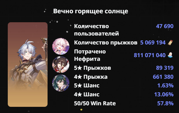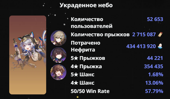 >>5156758 Чел ну зайди в китайскую трекер и посмотри и сравни. Ты сейчас копиума наворачиваешь ебанутого. Факт в том что кол-во круток коррелирует с доходами. Если баннер дохуя принес, то и на сайте видно что крутило много людей если банер принес мало, то и круток данного банера мало. Кошку крутило мало на сайте и доход маленький. Светляк имеет приличный доход и на сайте дохуя людей отметилось что крутило. Исключение текущий баннер которого крутит мало, но доход ебанутый это значит что доход приносит не сам баннер, а что то вторичное рераны скины закупка перед чем то большим. Точнее сможем ответить только в след патче когда больше людей подгрузит стату, но на данный момент всё очень плохо