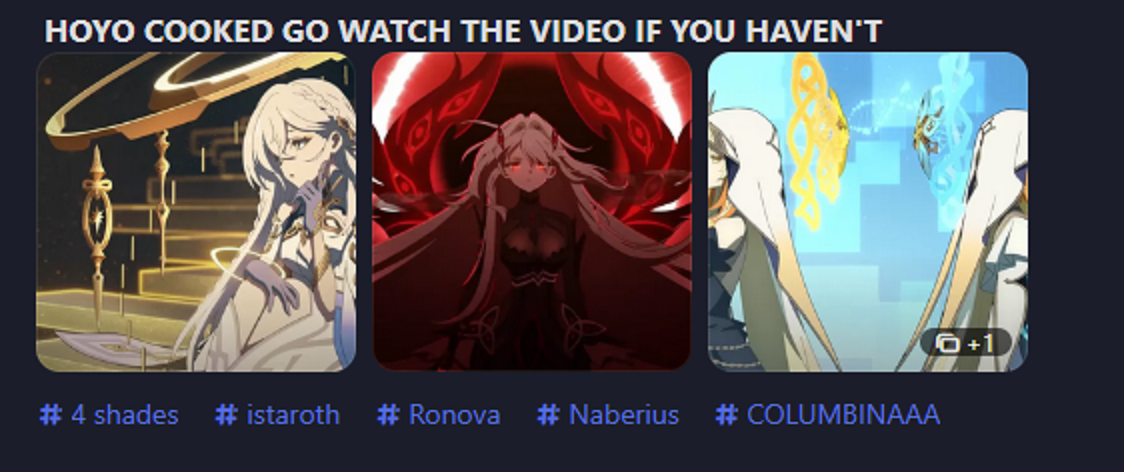 Ну что, какие у меня первые мысли по просмотренному тизеру, попробую упорядочить. Сейчас будет дохуя текста. 1) Дали очень жирный намек, что Паймон наша - это тень пространства, она же Асмодей. Раньше, кстати, популярной теорией было что Паймон - это тень времени, которая И/Астарот, а оказалось вон оно как. Мое мнение? Есть, на мой взгляд, одно большое но. В последнем квесте близнецов, в самом конце, мы лично видим как Асмодей наблюдает за нами через свои порталы, что как бы явно не состыкуется с теорией о Паймон - богине пространства. 2) Рейн спокойно общается с другими тенями словно они тысячу лет уже как лучшие подружки. И никого очевидно не ебет, что она сожрала их сестру. Интересные у них взаимоотношения, конечно. Уровень лояльности ее Небесному Порядку при этом можно оценить, когда речь заходит о Царице и та фактически говорит, что крио-архонт все правильно делает, отчего даже Набериус охуевает и вылезает напомнить Рейн, чтобы не выебывалась. 3) Ронова. У меня ведь не одного такое чувство, что та Ронова, которую мы видели в сюжетке Натлана отличается от той, что показана в тизере? В сюжете она представлена довольно неглупой и рассудительной, не лишенной доли сострадания и готовой идти против указов Небесного Порядка. Вспоминаем Шбаланке, если что. Здесь же, в тизере, она показана бессмысленно жестокой (птичку убивает вообще ни за что), глупой (вообще не в курсе, что за ней все время следил Пьеро) и что самое, пожалуй, интересное, самой лояльной Небесному Порядку из всех трех теней. Что с ней случилось за все это время, как думаете? Только по существу, а не всякое типа да Ляо опять с ретконом обосрался! 4) Пьеро собрался убить бога. Смотрю, многие почему-то решили, что речь идет о мести Ронове, хотя он отчетливо говорит о боге в мужском роде. Даже если это косяк перевода, то он также упоминает, что бог сейчас дремлет, а Ронова явно активна и не бездействует. Так что, мне лично кажется, что речь скорее о Фанете. 5) Помню когда куча съебал от фатуев, с гнозисом между прочим, за ним вдогонку послали одного Торта. А тут за пропавшей Субреткой целая толпа фатуев с пердами выехали. Думайте, как говорится.