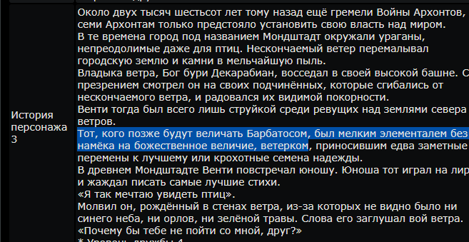 >>5190875 >>5190862 Вот не поленился и загуглил. В игре есть знаменитое выражение Seeds of stories, brought by the wind and cultivated by time. Венти стучит в дверь, спрашивают, кто там? Венти: — Seeds of stories, brought by the wind Внезапно Паймон: — and cultivated by time
