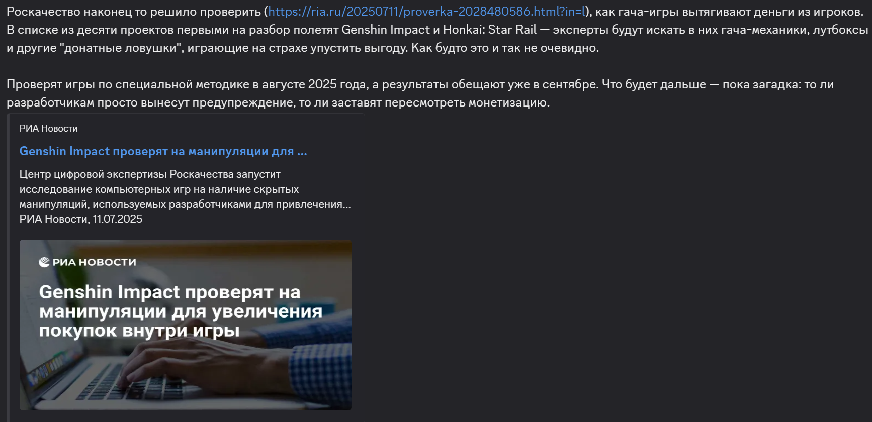 >МОСКВА, 11 июл - РИА Новости. Центр цифровой экспертизы Роскачества запустит исследование компьютерных игр на наличие скрытых манипуляций, используемых разработчиками для привлечения денежных средств игроков, сначала тестироваться будут приключенческие игры, в том числе Genshin Impact и Honkai: Star Rail, рассказали РИА Новости в организации. >"Центр цифровой экспертизы Роскачества приступает к масштабному исследованию по выявлению скрытых манипуляций, которые используют разработчики видеоигр, чтобы "подсадить" игроков и заставить их тратить больше денег. Сперва центр... будет тестировать приключенческие игры, в том числе Genshin Impact и Honkai: Star Rail. По планам исследовать до десяти игр, список проверенных игр будет постоянно пополняться", - говорится в сообщении Роскачества. >Там также отметили, что для анализа была разработана специальная методика, которая позволяет оценить, насколько в игре распространены скрытые манипулятивные механики для удержания внимания игроков и увеличения их денежных вложений. Всего эксперты выделили 16 основных способов, в том числе покупка "лутбоксов" (виртуальных контейнеров, при покупке которых геймер получает случайный игровой предмет) и участие во временных акциях, которые вызывают у человека страх упустить выгоду. >Тестирование игр начнется в августе, а первые результаты проверки будут опубликованы в сентябре, следует из сообщения организации. Genshin Impact - компьютерная онлайн-игра с открытым миром, выпущенная китайским разработчиком MiHoYo Limited в 2020 году. Распространяется бесплатно, но содержит внутриигровые покупки. Honkai: Star Rail - ролевая компьютерная игра с внутриигровыми покупками от разработчиков Genshin Impact. Выпуск игры состоялся в 2023 году на всех основных платформах, в том числе мобильных.