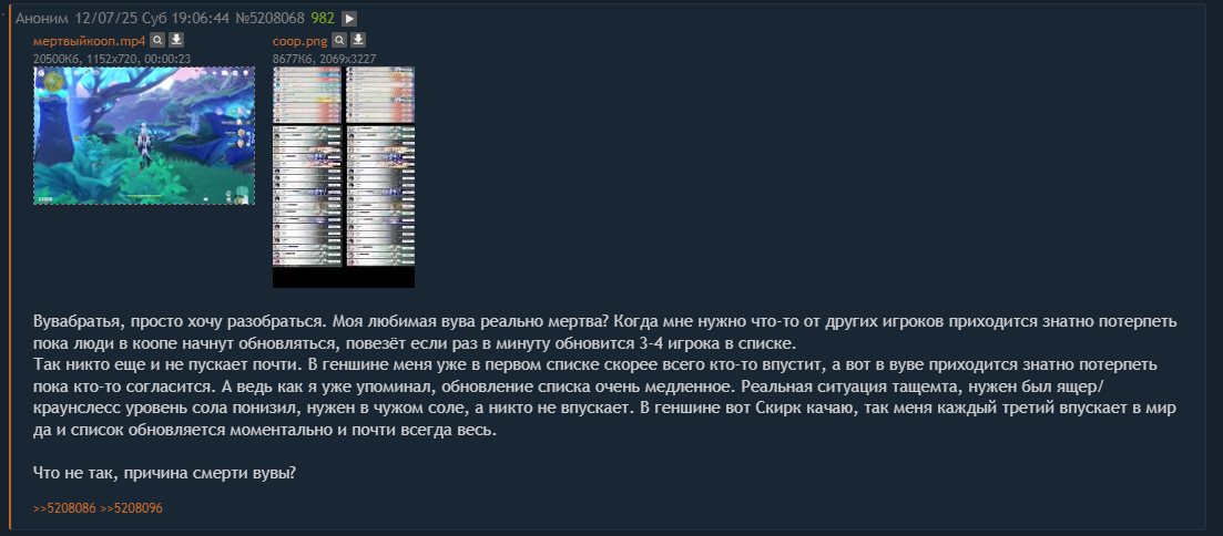 Вувабратья, просто хочу разобраться. Моя любимая вува реально мертва? Когда мне нужно что-то от других игроков приходится знатно потерпеть пока люди в коопе начнут обновляться, повезёт если раз в минуту обновится 3-4 игрока в списке. Так никто еще и не пускает почти. В геншине меня уже в первом списке скорее всего кто-то впустит, а вот в вуве приходится знатно потерпеть пока кто-то согласится. А ведь как я уже упоминал, обновление списка очень медленное. Реальная ситуация тащемта, нужен был ящер/краунслесс уровень сола понизил, нужен в чужом соле, а никто не впускает. В геншине вот Скирк качаю, так меня каждый третий впускает в мир да и список обновляется моментально и почти всегда весь.
