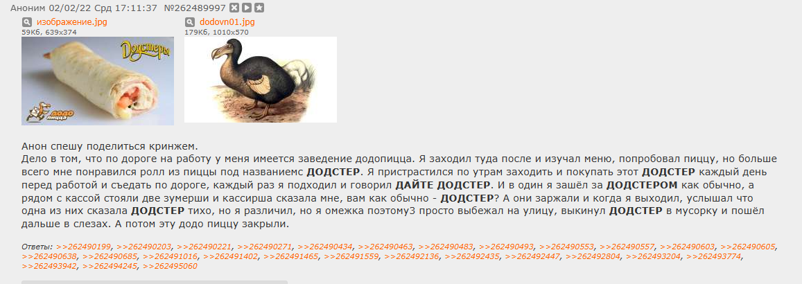 >>5215452 Так и есть Но в Додо-пицце буквально есть хуёвая шаурма, которая называется Додстером В этом и шутка, что Додо пицца это додики, и они готовят додстеров