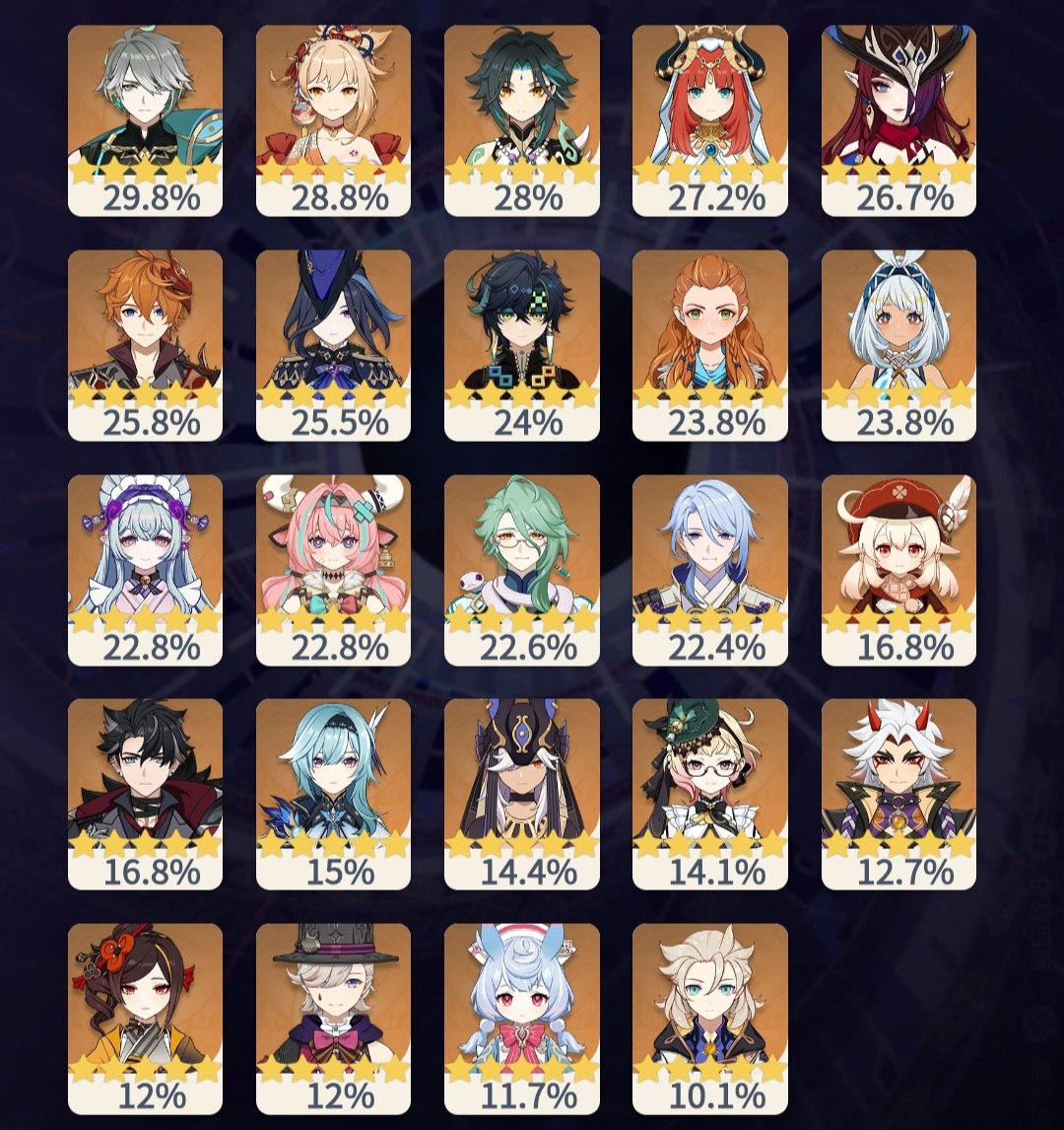 >>5238231 У элой (кто это?) всего 23%, а ее раздавали бесплатно на 1 годовщину Получается все остальные иназумеры и более поздние ньюфаги А кли не было смысла крутить уже на первом реране во время архипелага