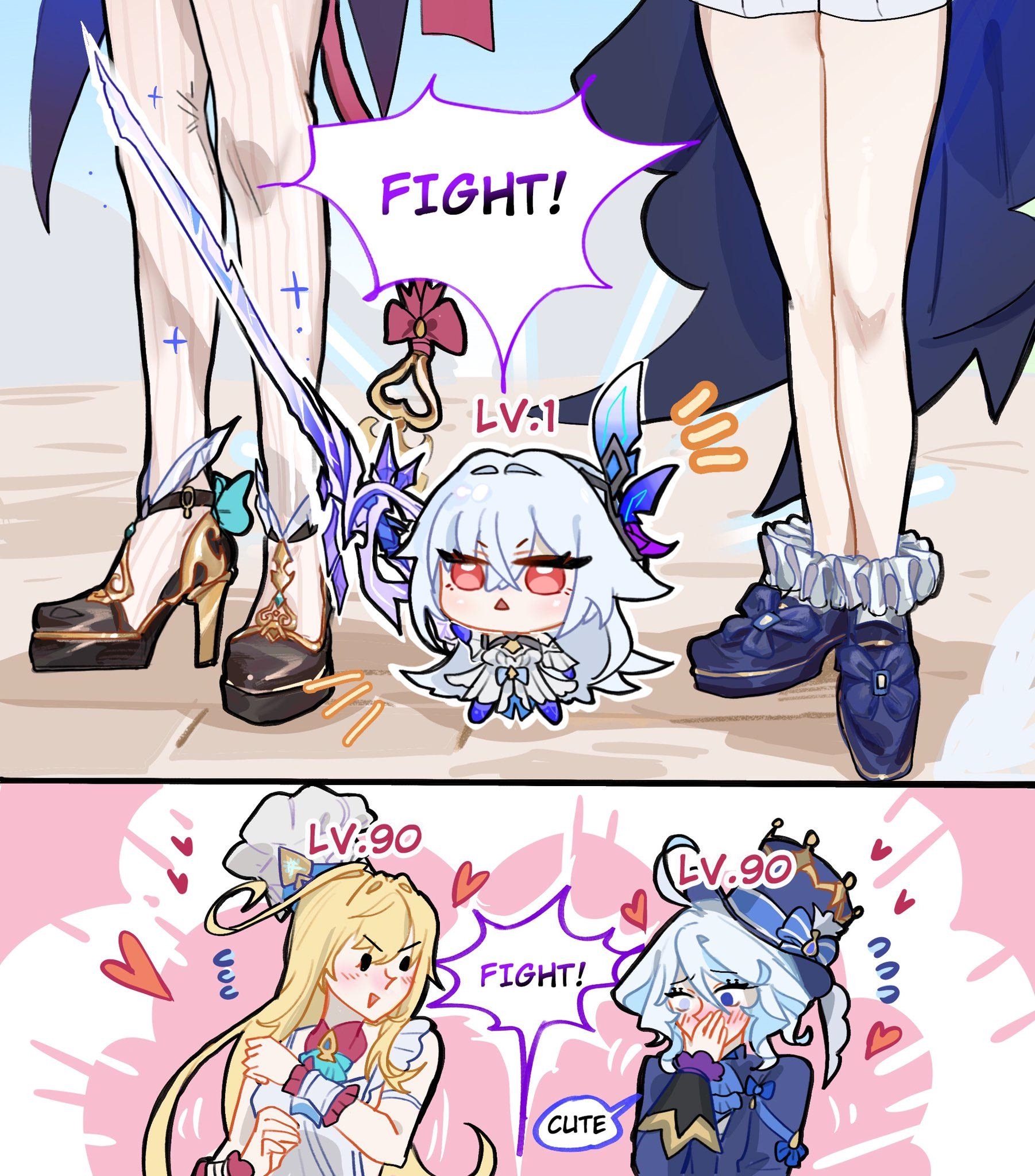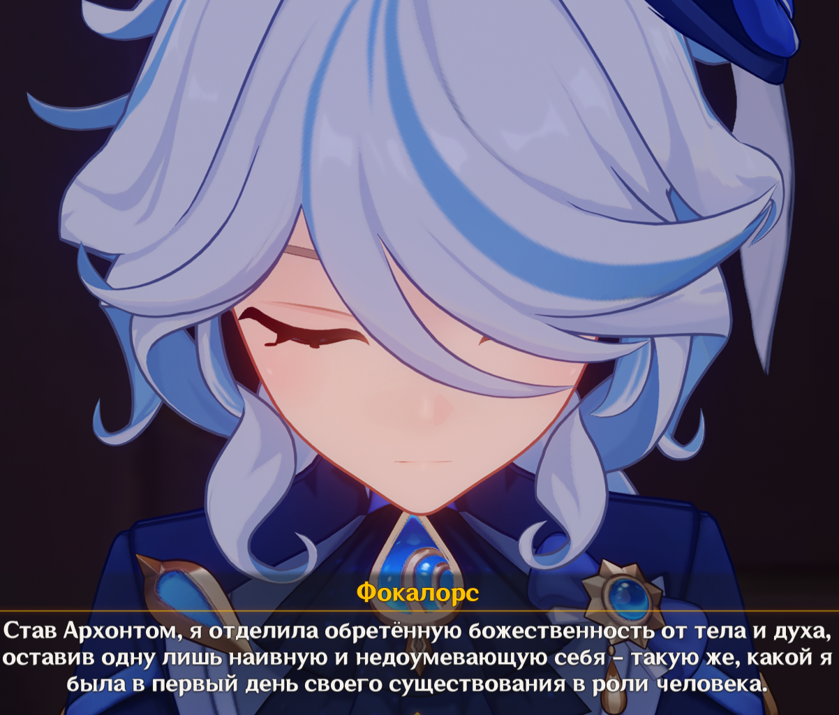 По моей шизотеории (во многом основанной на трейлере Фурины и её историях) она была полноценным архонтом. Фонтейн затопило, все растворились, а она сидела и плакала. Потом она каким-то образом смогла это переделать - устроила временную петлю, вернулась в прошлое, вытащила откуда-то Невилета и провернула трюк с разделением.