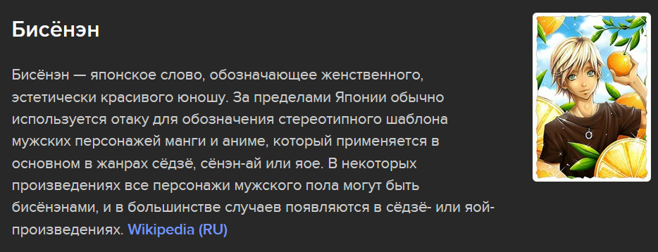 >это стиль рисования отомэ/яоя/седзе Которые бывают аниме и к этому претензия. Претензия что рисуют для тянок, которые такое смотрят по очевидным причинам. По тем же по которым нам охуенных девиц рисуют, а не стремных паймон. Это в порядке вещей, это фансервис. По-моему это ты дураком прикидываешья зачем-то. Мне похуй как ты это назовешь, он выглядит хуево, как и остальные мужские персонажи. Если ты любитель просмотра аниме с такими сладкими мальчиками, то наверное тебе и норм, рад за тебя, но ты не в большинстве в данной ветке.