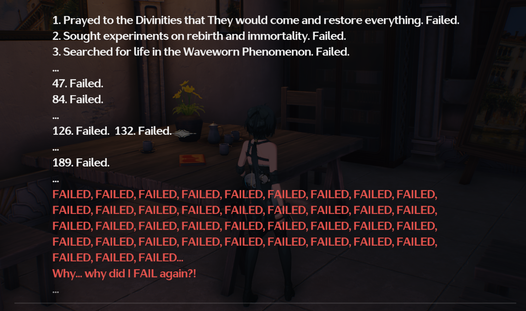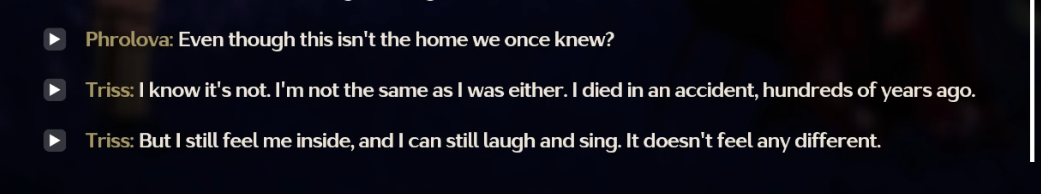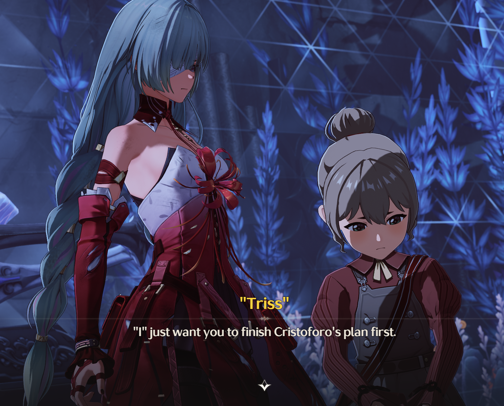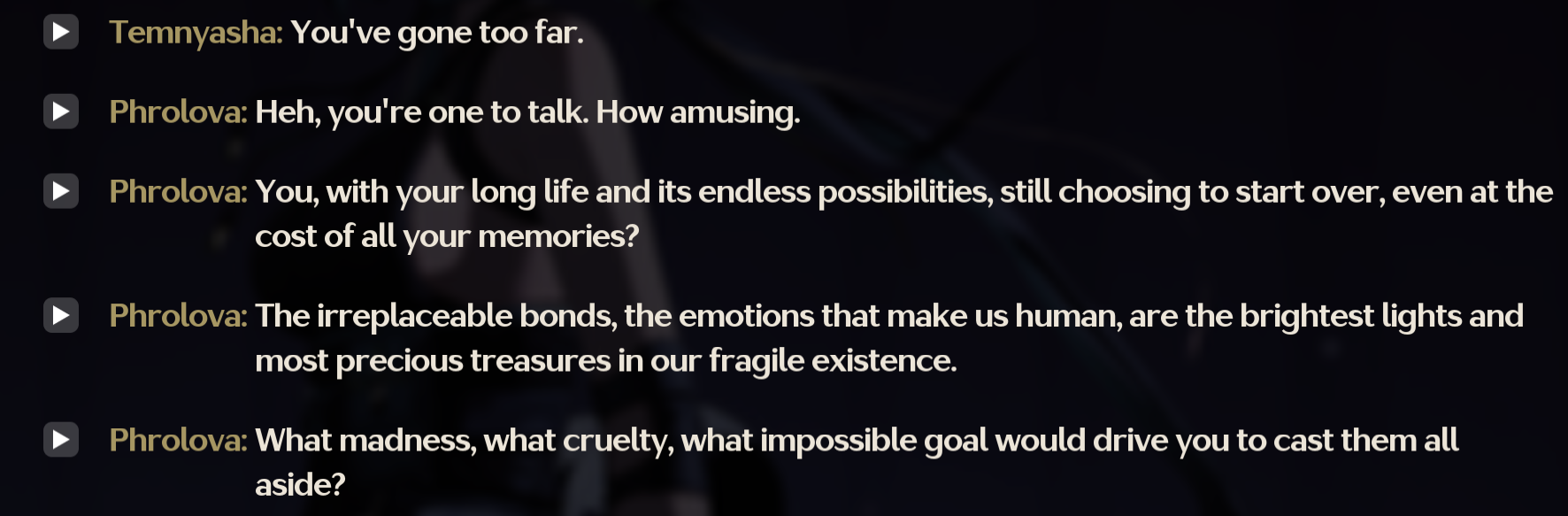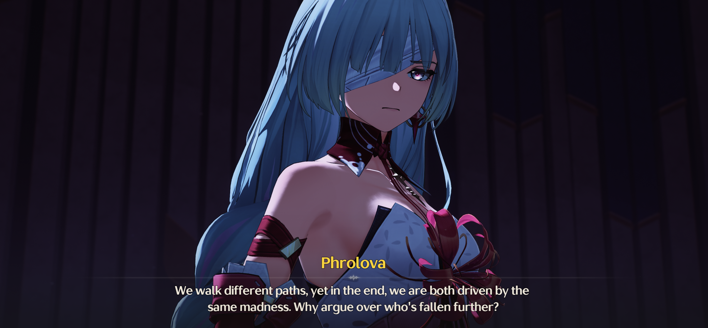Как же ей манипулирует... Ну в перспективе видится, что её Фракты и обломят сами в итоге, предав. «Трисс»: Запределье уже становится частью тебя. Как только ты наберёшься сил, чтобы открыть врата, ты сможешь запереть его там. Вместе с «нами». Навечно. Фролова: ... «Трисс»: О? Задумалась? Неужели тот миг, что был между вами, и правда важнее «нас»? Фролова: Ты не так поняла. Его всегда ждало место в Запределье. Если я запру его сейчас — это ничего не изменит. В конце концов, он исполнит своё обещание мне именно там.