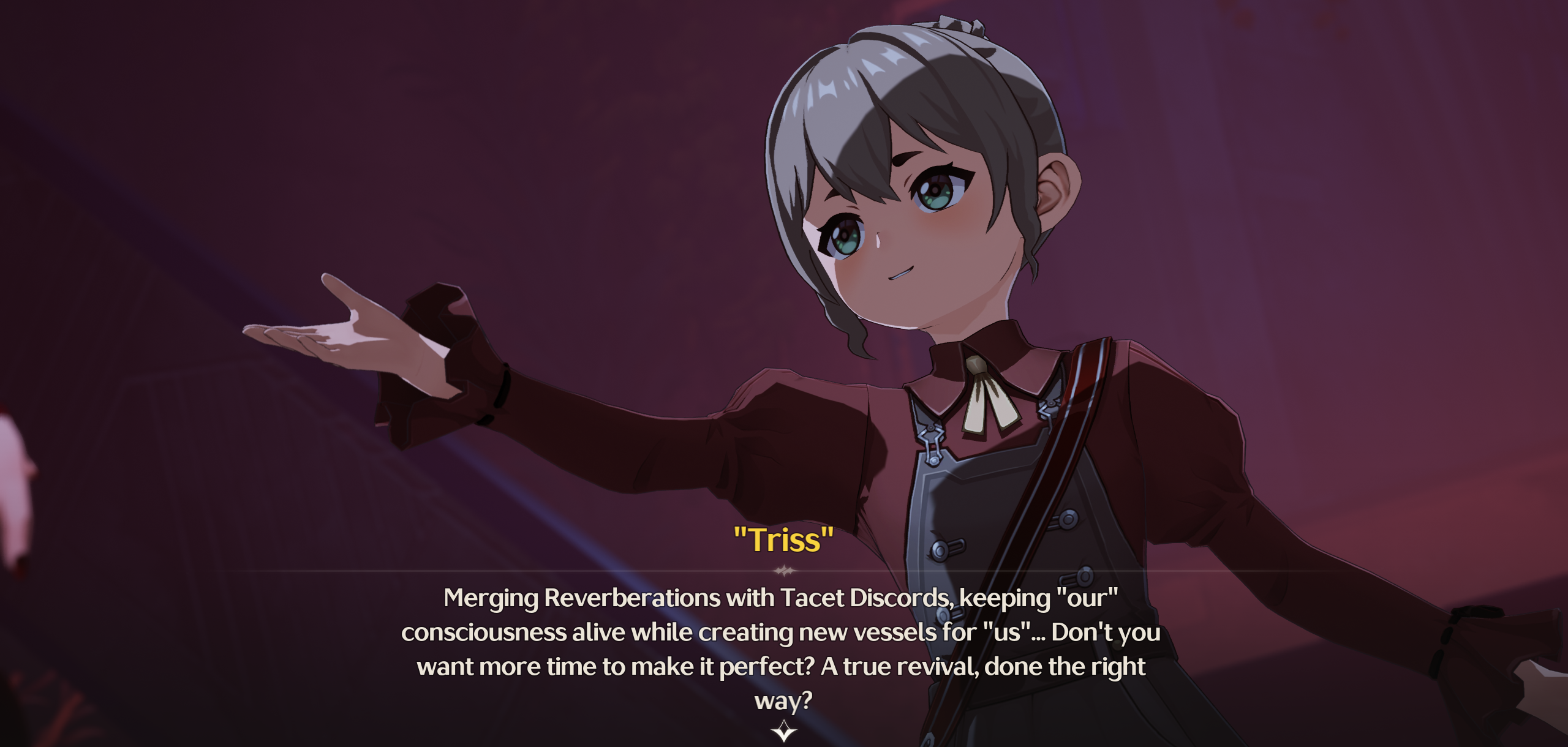 >>5282897 Так понятное дело. Заметь, что она при этом не готова не убить, не попытаться запереть Ровера. В основном как раз из-за его природы и того, что она совершенно точно понимает, что ее утопия неидеальна и в сути своей несовершенна. Третий сторик в ее профиле как раз о ее самоубеждении о том, что любые проблемы (бреши в тексте) в рамках достижения ее мечты - это допустимые обстоятельства. Которые в единой композиции представляют из себя просто то, что должно быть. Идеальные бреши здесь это как раз реверберации покойников в остовах тасетов, которые будут считаться людьми покуда она сможет эту иллюзию поддерживать. При этом она не может позволить себе натурально подставить Ровера и, возможно, потерять единственного человека, который действительно останется живым и настоящем вне времени и пространства.