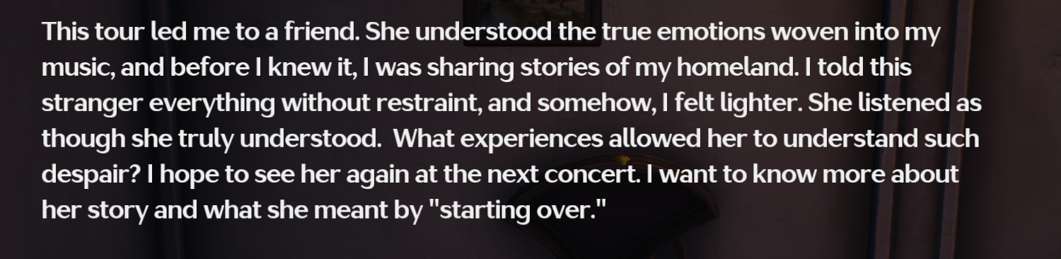 Сколько раз это уже случалось? Сколько раз он пытался отпустить... только чтобы вновь сжать руку сильнее? Жизнь хрупка, как дрожащие листья в дыхании зимы — их тихий плач уносит ветер. Чем всё мимолётней, тем труднее понять: верны ли были наши выборы? Чтобы найти в них смысл, нужно сперва пройти путь, что тянется в "вечность". С душой, что тянется к краю мира, как моя... и как его... Даже если заблудился на перепутье — не стоит отчаиваться. Как бы далеко ты ни зашёл, всегда можно повернуть назад и найти дорогу домой.