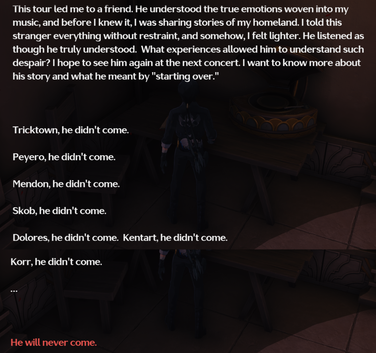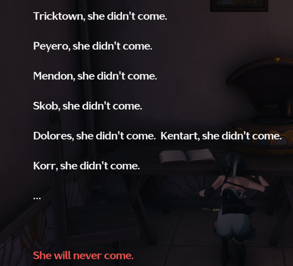 А вот и обидка... Ну вообще что можно сказать? Ровер это прямо источник её безумия в его основе. Она буквально повторяет те же самые фразы, что говорил ей он, и её девиз к действию это буквально его слова. В частности "over start", ведь она тоже, как он, "i fear starting over". И вместе с тем для неё это корень обиды. Кстати, на момент убийства Фроловы: да, это очень неприятно. Но тут знаете, что неприятнее? Сама-то она не то, чтобы считает этот момент предательством, как писал Фрловашиз. Она же говорит "мне жаль", когда тонет. Очень скорбным голосом. Будто саму себя презирает. Будто ей самой неприятно предавать того, кого она ждала. И именно это бьёт ещё сильнее, чем если бы она видела предательство в убийстве. САМОЕ ВАЖНОЕ: обратите внимание, что когда она тонет, на фоне играет ОСТ из личного квеста Камели, только в печальных тонах... Это вот самое грустное.
